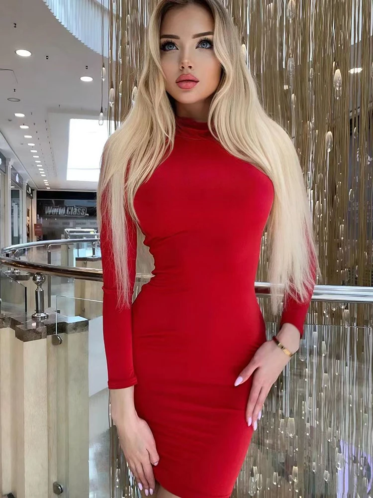 Fleepmart Long Sleeve Slim Bodycon Mini Dress Women Turtleneck Pleated Party Ruched Short Evening Club Outfit