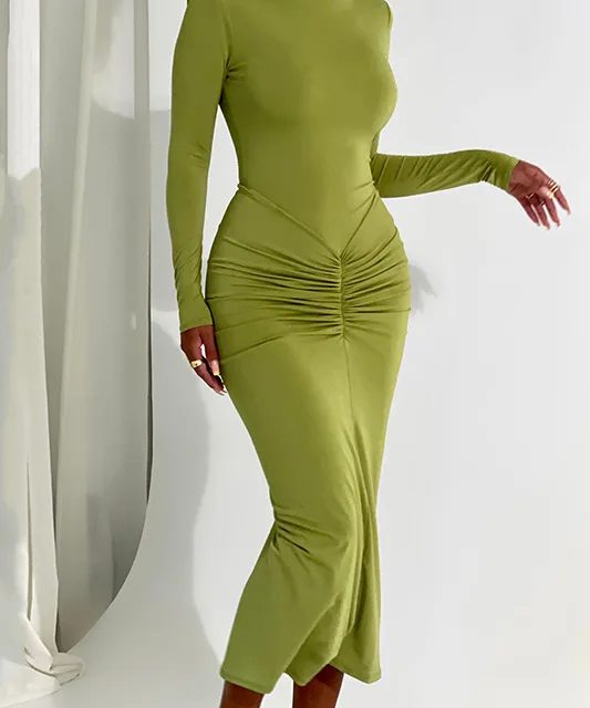 Fleepmart Long Sleeve Slim Bodycon Mini Dress Women Turtleneck Pleated Party Ruched Short Evening Club Outfit