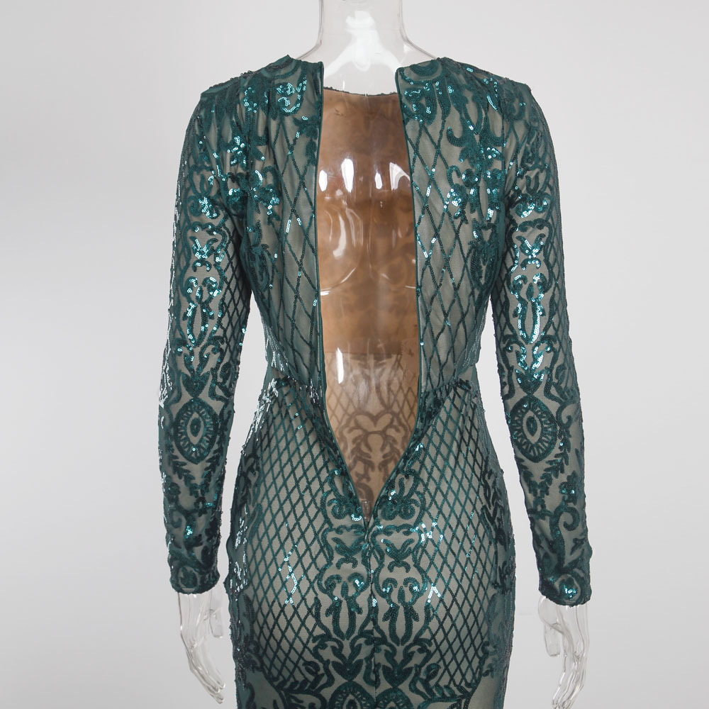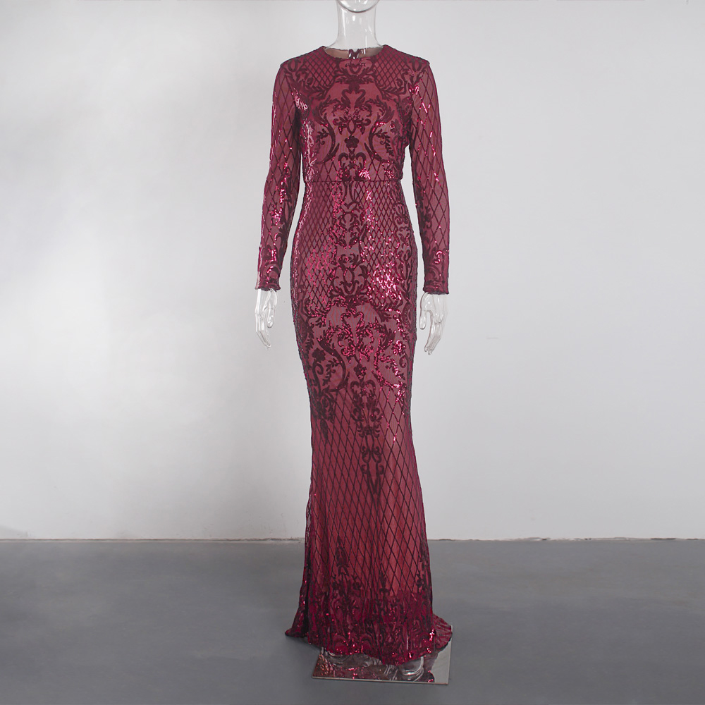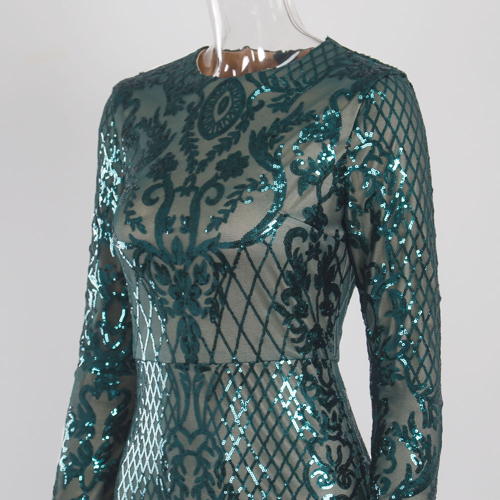 Fleepmart Long Sleeve Stretch Sequin Party Dress O Neck Full Lining Floor Length Evening Night Gown Emerald