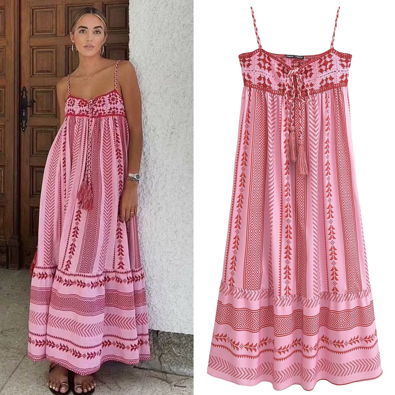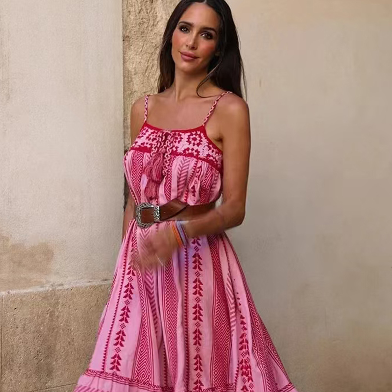Fleepmart Long Women’s Embroidered Sleeveless Backless Summer Midi Loose Lace-Up Slip Beach Dress