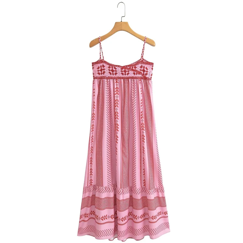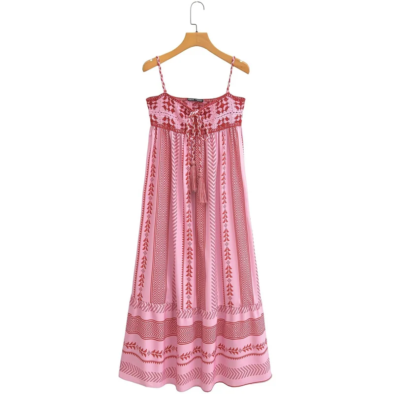 Fleepmart Long Women’s Embroidered Sleeveless Backless Summer Midi Loose Lace-Up Slip Beach Dress