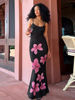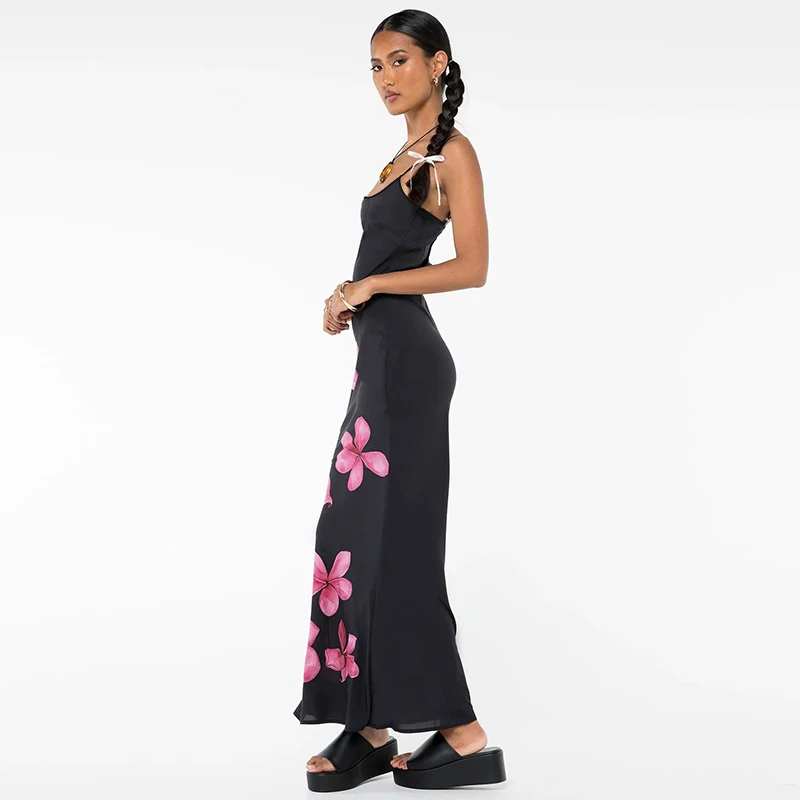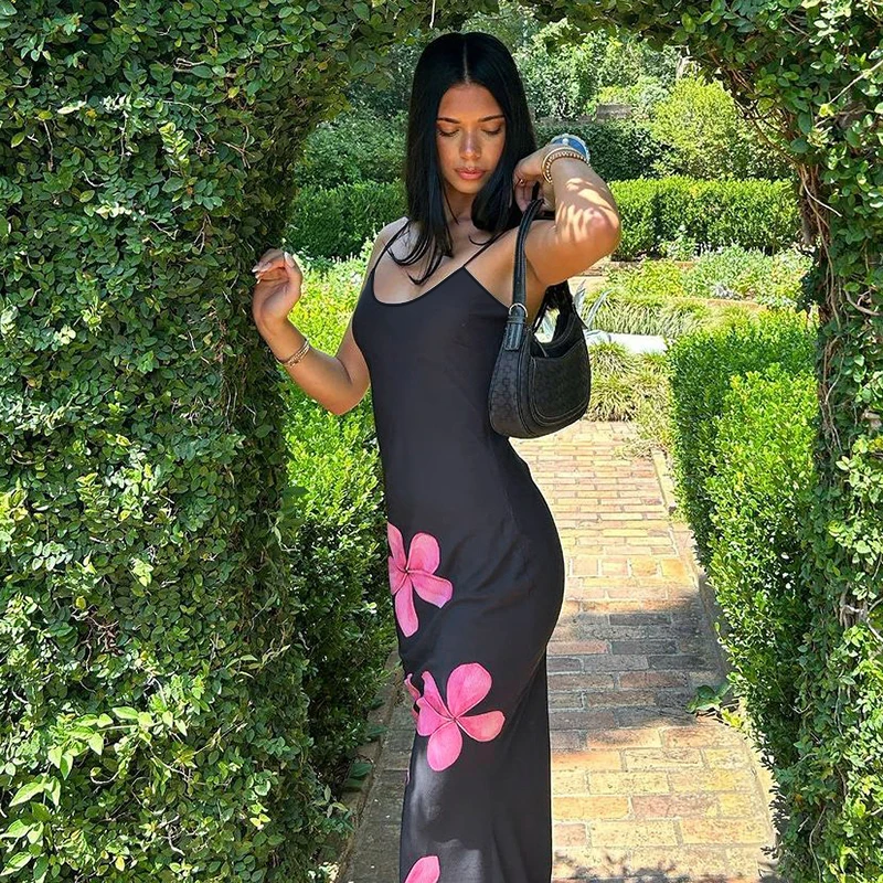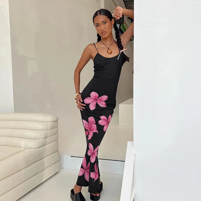 Fleepmart Low Cut Long Bodycon Sling Dress Women Floral Print Backless Spaghetti Straps Club Party Maxi Dress Y2k Cami Dress