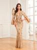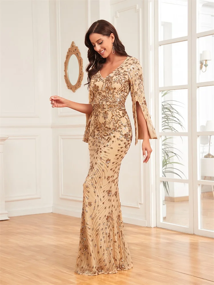 Fleepmart Luxury Champagne Evening Dresses For Women 2024 Long Sleeve Mermaid Formal Sequins V-neck Prom Wedding Party Gowns
