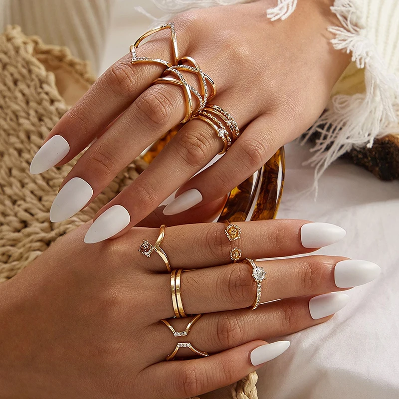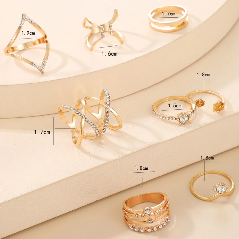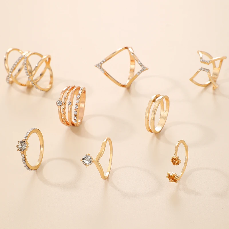 Fleepmart Luxury Crystal Stone Geoemtry Gold Joint Ring Sets for Women Charms Alloy Metal Open Ring Jewelry Anillo 8pcs/sets