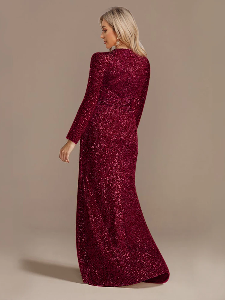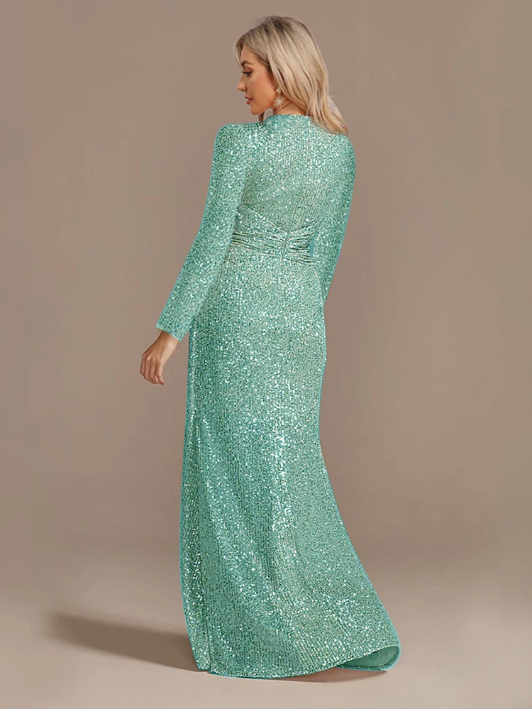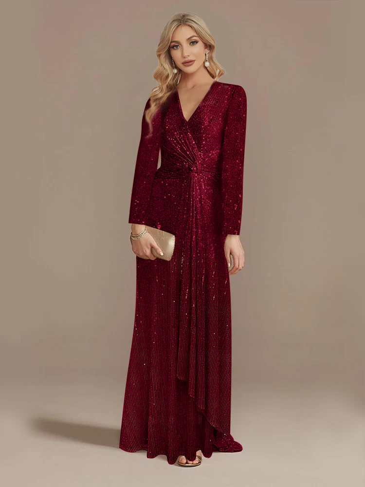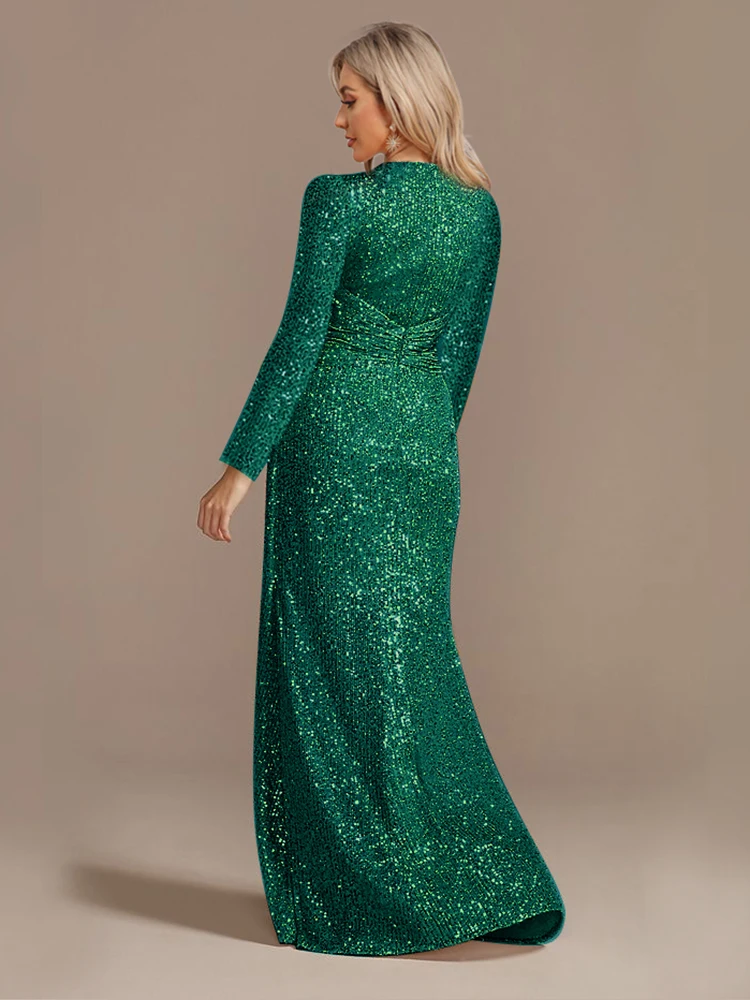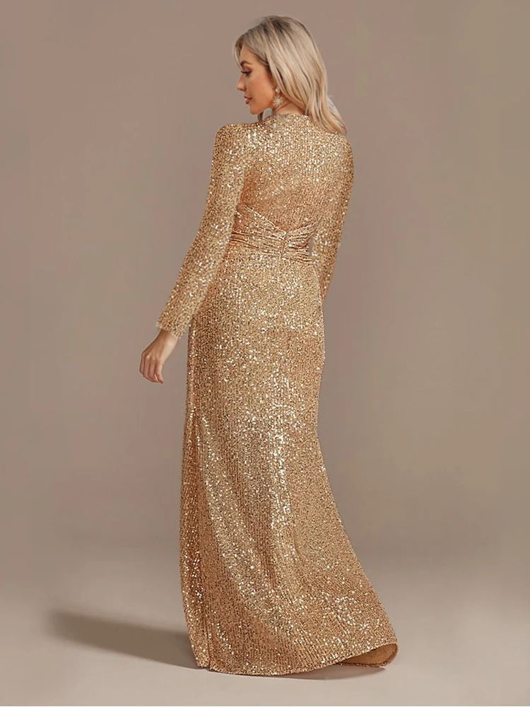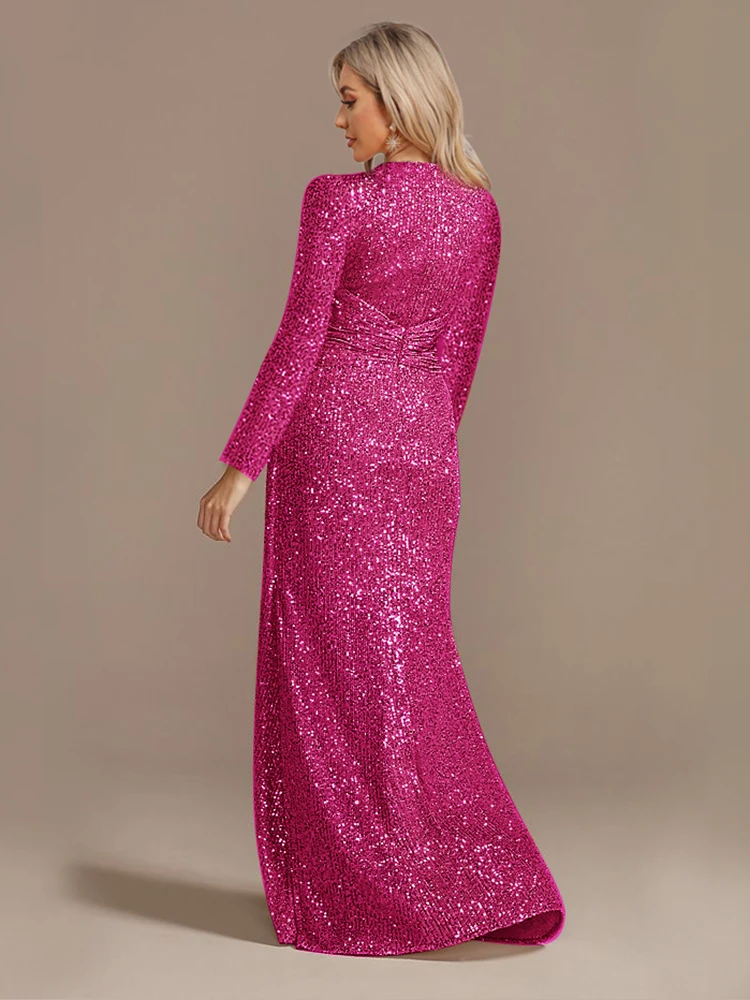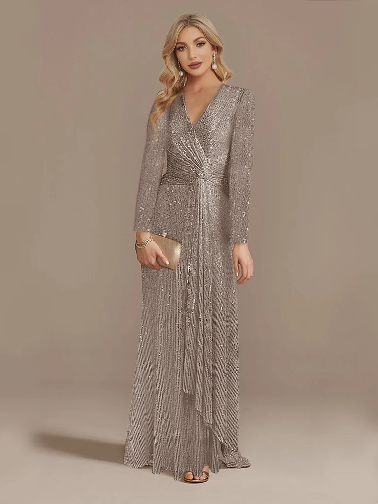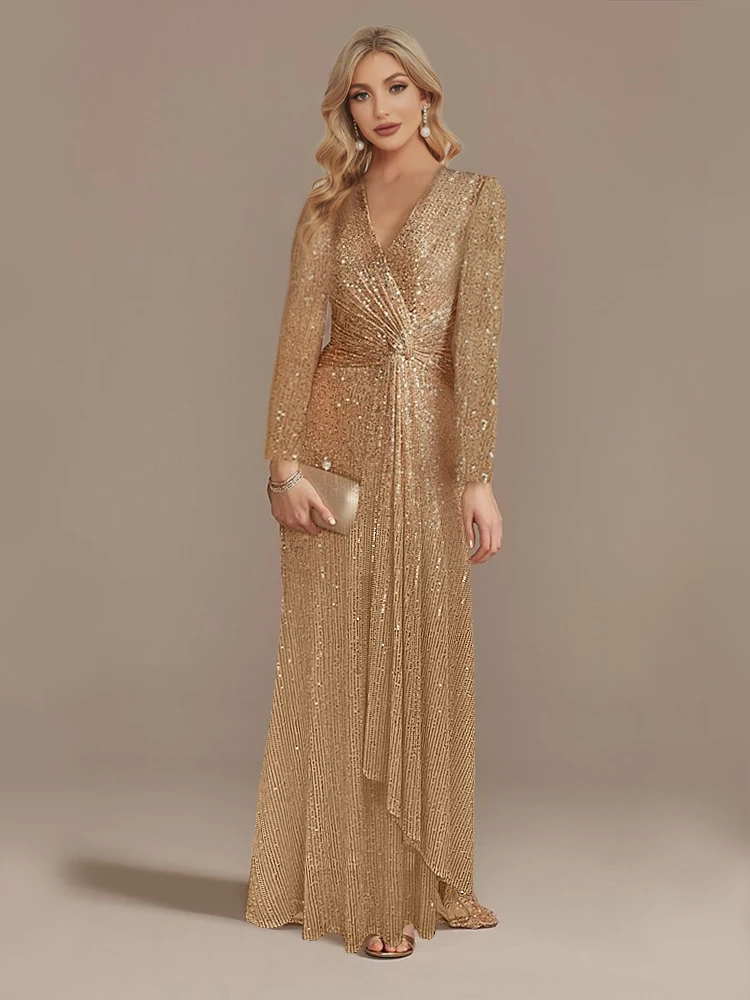 Fleepmart Luxury Floor Length V-Neck Evening Dress 2024 Women Elegant Party Maxi Dress Sequin Long Sleeves Prom Cocktail Dress