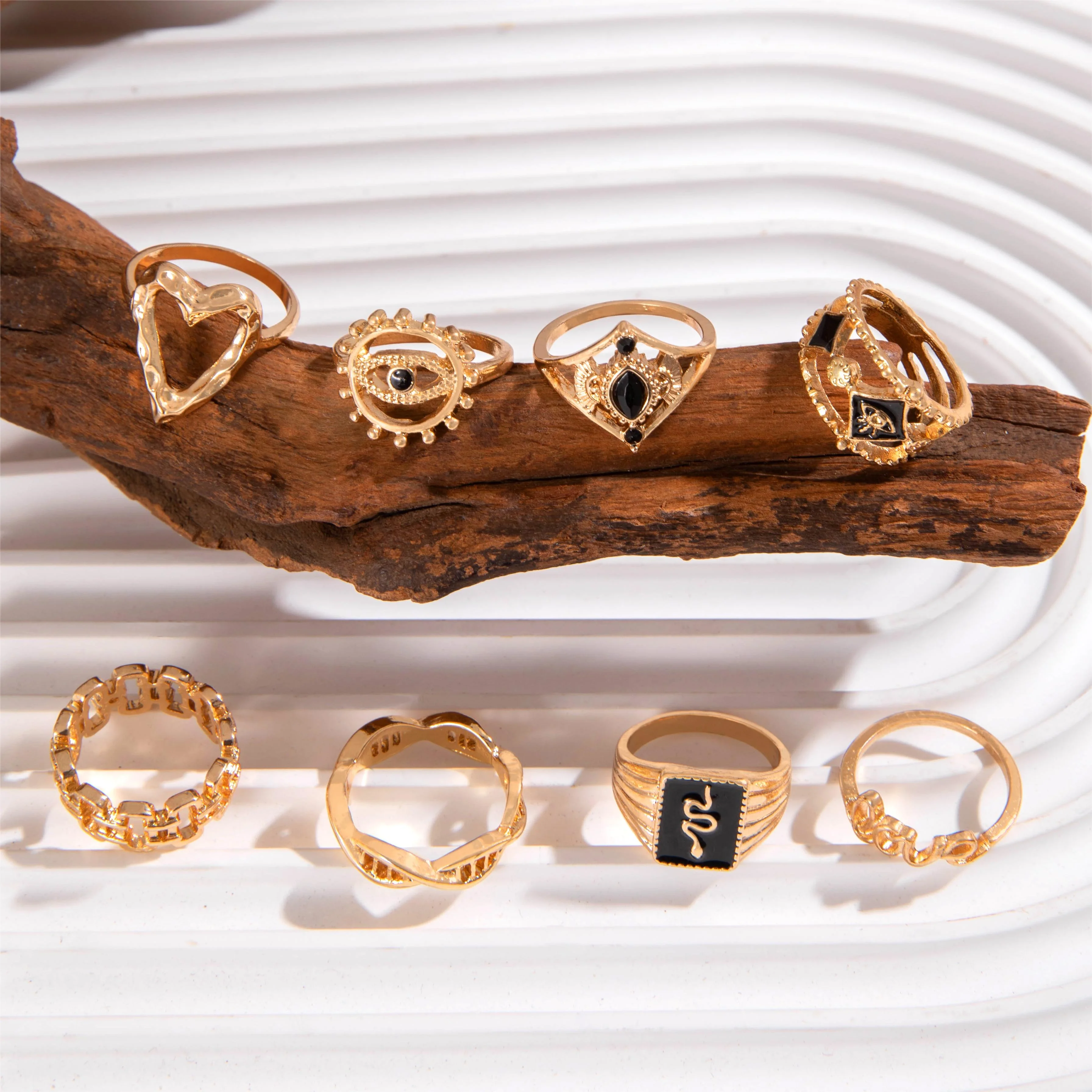 Fleepmart Luxury Gold Color Eye Heart Joint Rings Set for Women Classic Letter Snake Ringns Set Jewelry Party 8pcs/set
