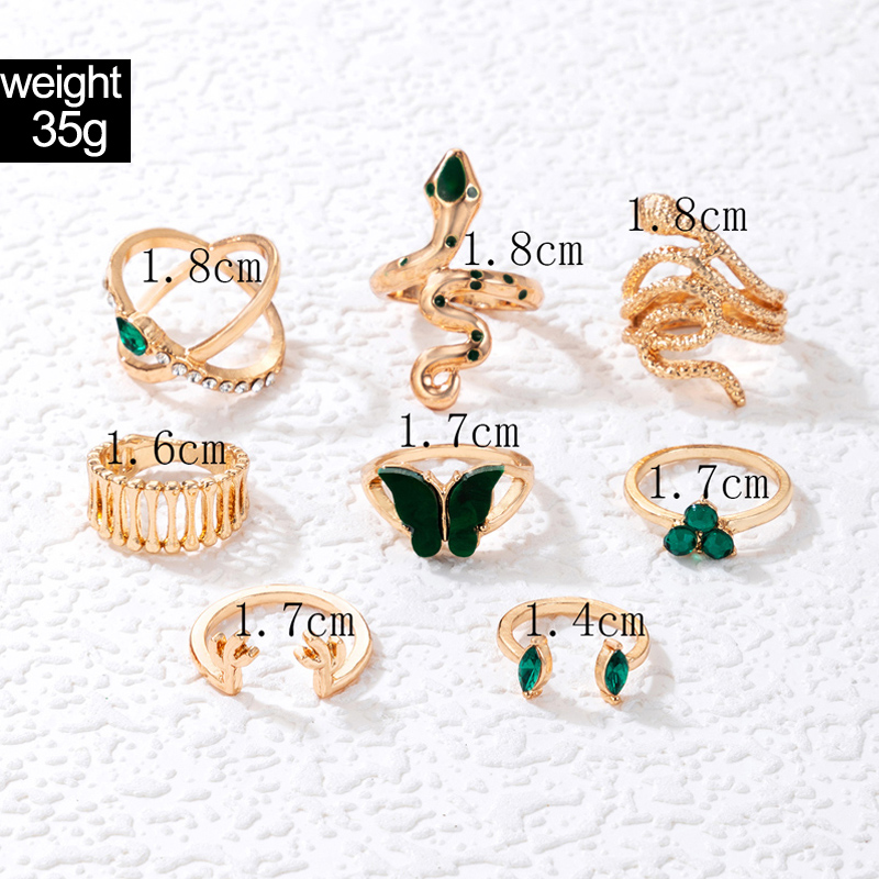 Fleepmart Luxury Green Crystal Stone Snake Joint Ring Sets Pretty Butterfly Geomtry Open Ring Jewelry for Women 8pcs/sets