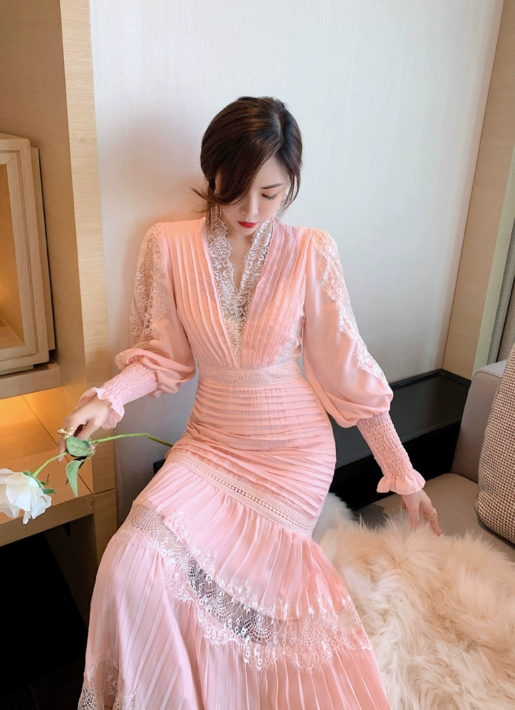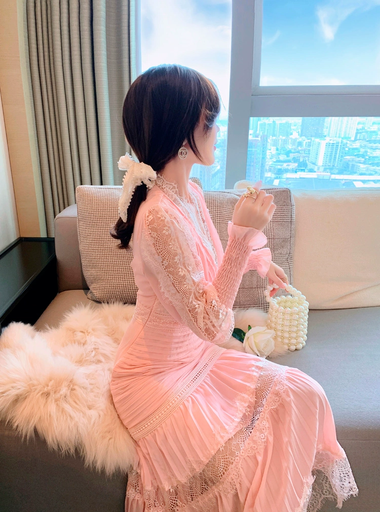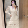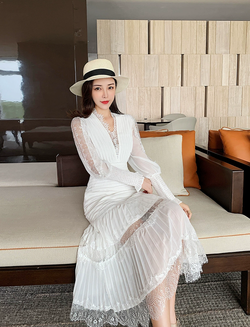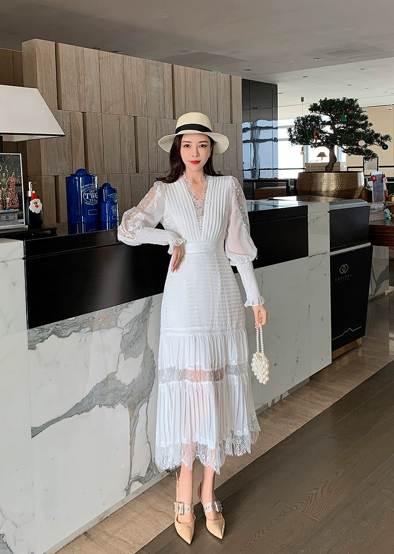 Fleepmart Luxury Long Lantern Sleeve Patchwork Lace Embroidery Dresses Women Party Elegant Spring Boho High Waist 2021 Dress