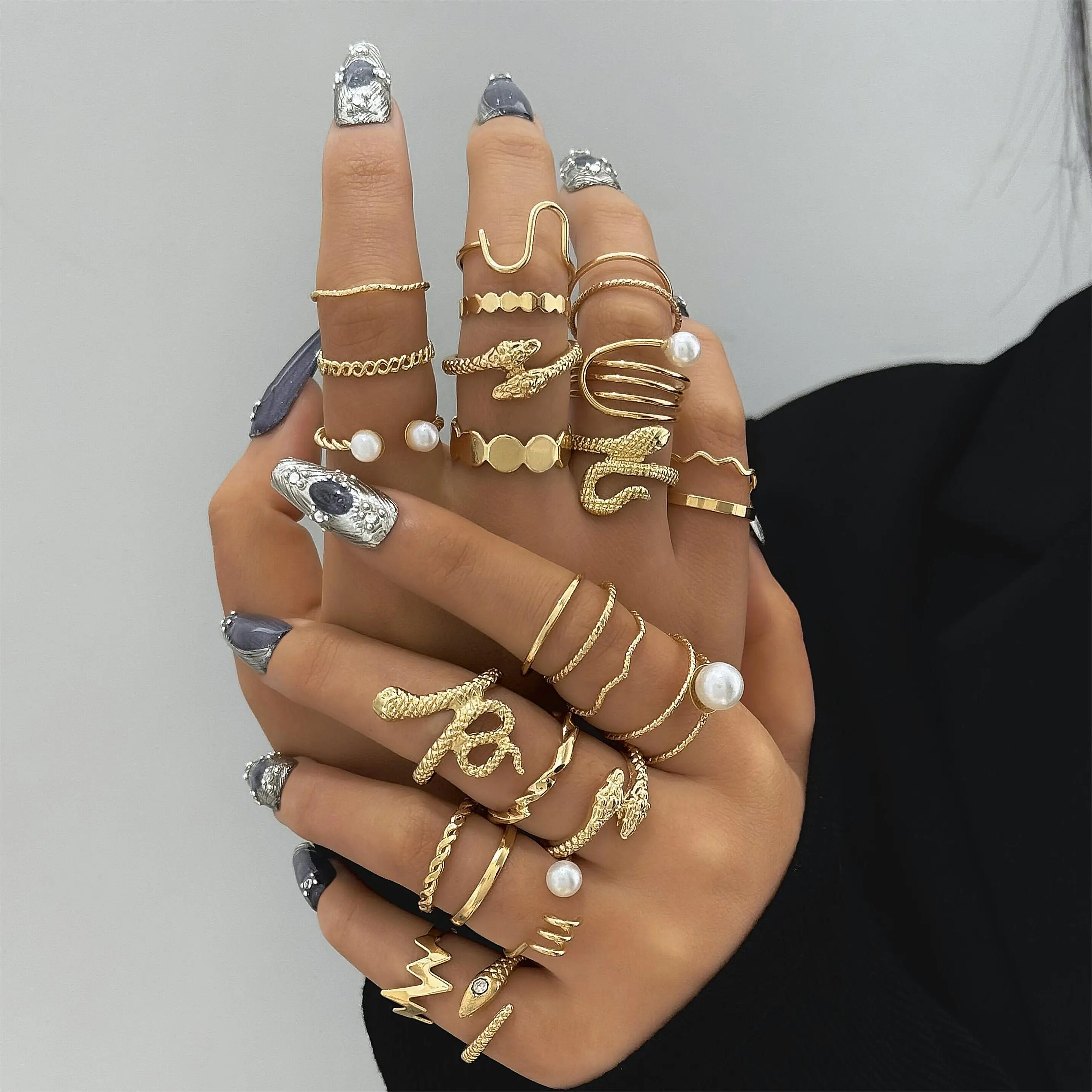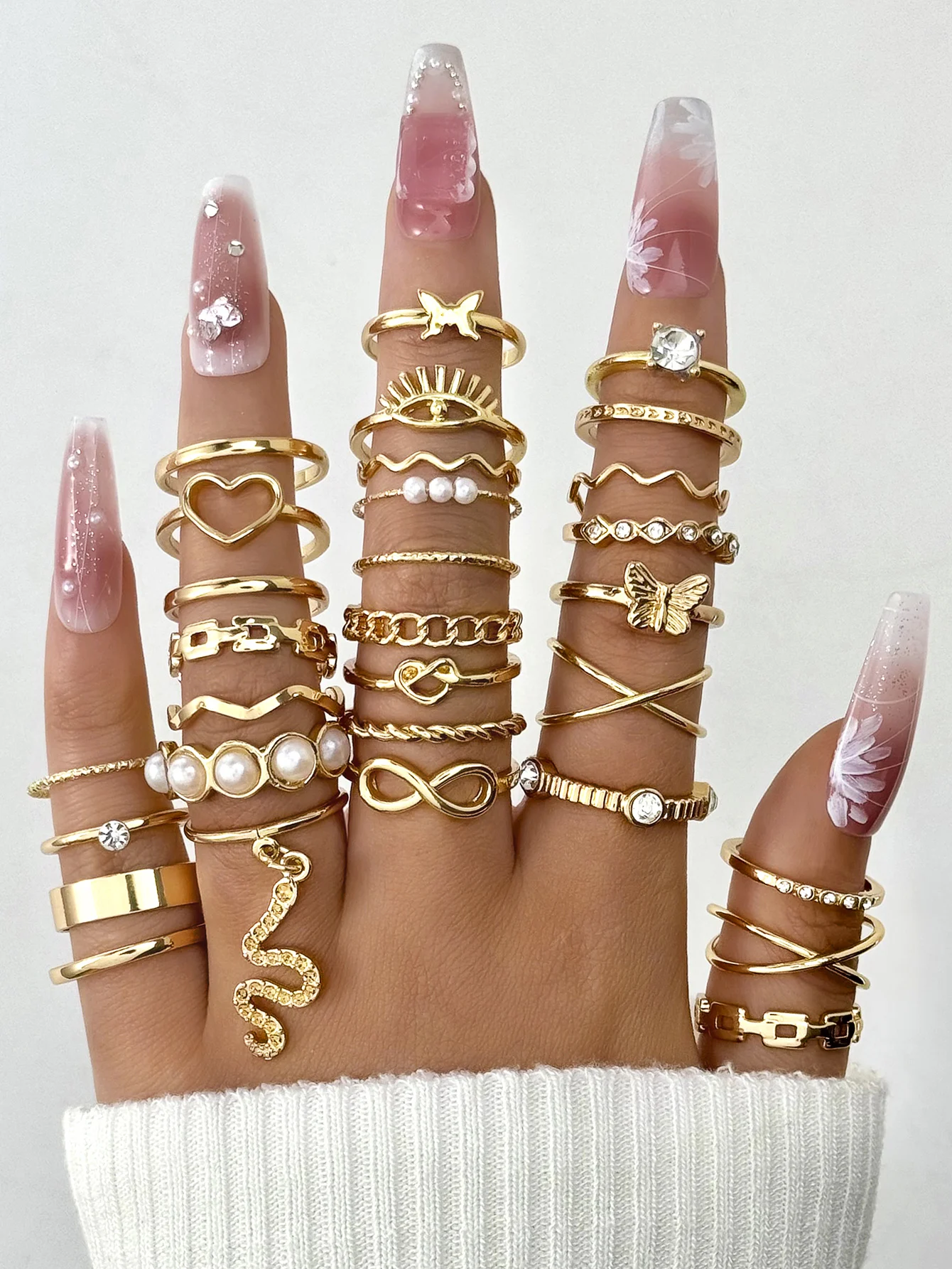 Fleepmart Luxury Pearl Stone Butterfly Finger Rings Set for Women Classic Eye Heart Rings Set Jewelry Party 30Pcs/Set