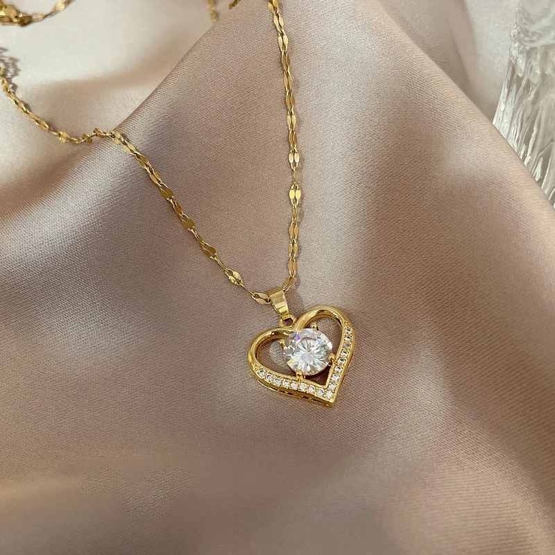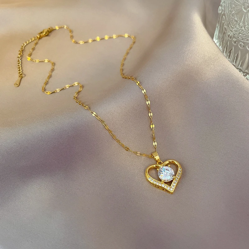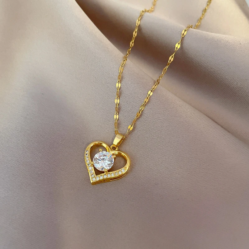 Fleepmart Luxury Shiny Zircon Crystal Heart Pendant Stainless Steel Necklace For Women Korean Fashion Female Wedding Jewelry Neck Chain