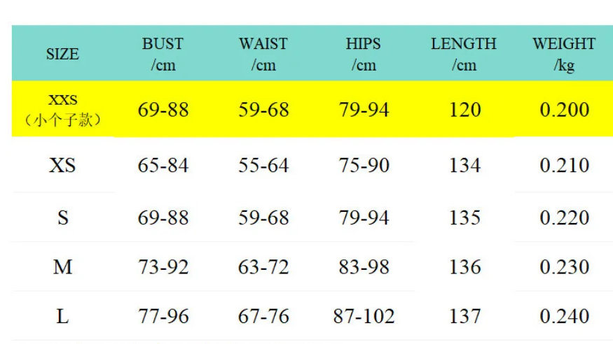 XXS Bust:68-88 Length:120 Waist:59-68 Hip:79-94