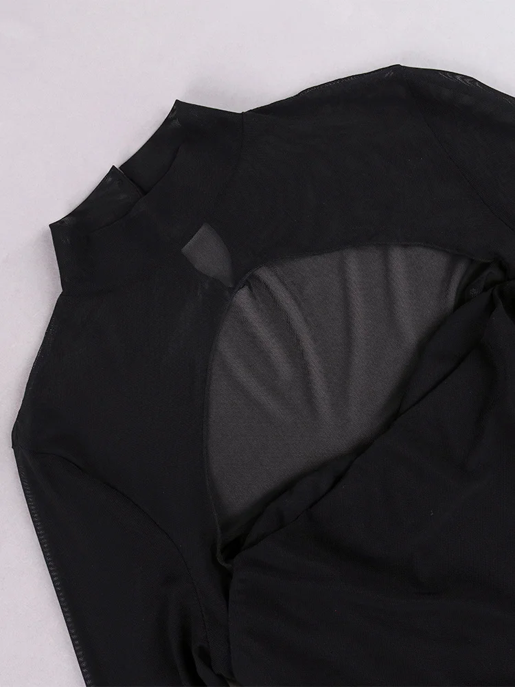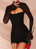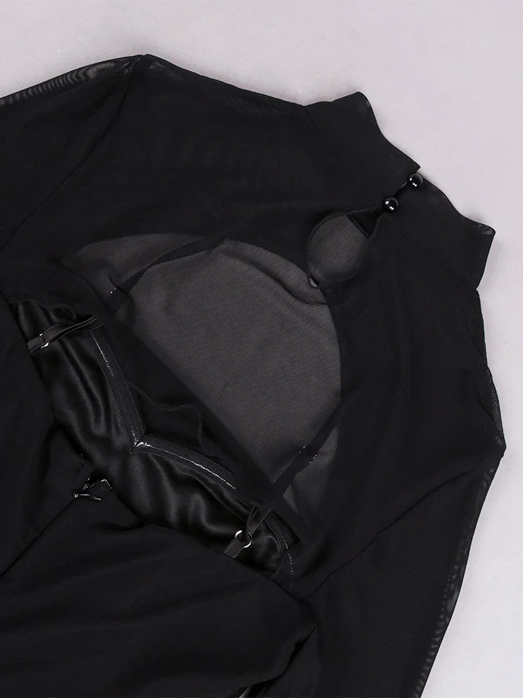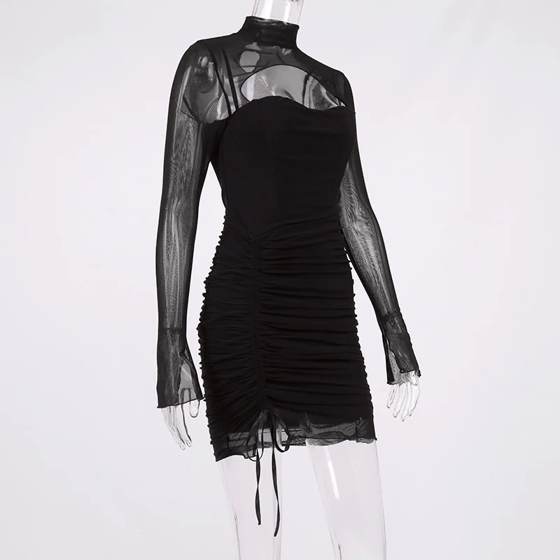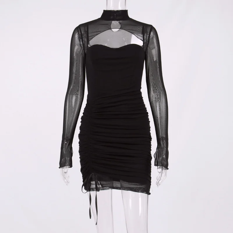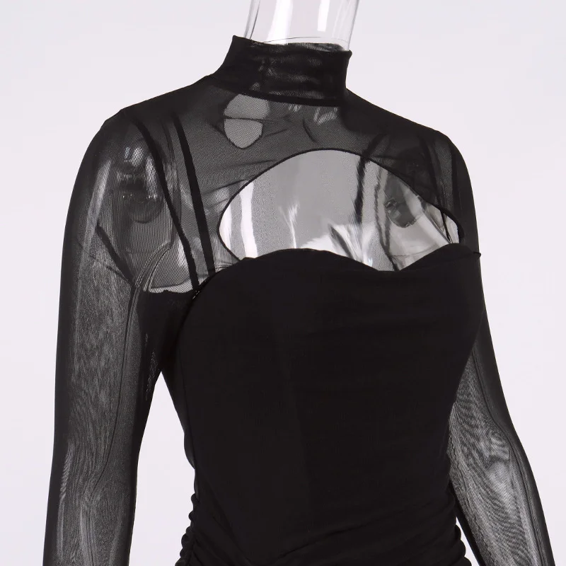Fleepmart Mesh Dress Boned Long Sleeve Cut out See Through Ruched Patchwork Bodycon Corset Dress Women Party Black Dresses