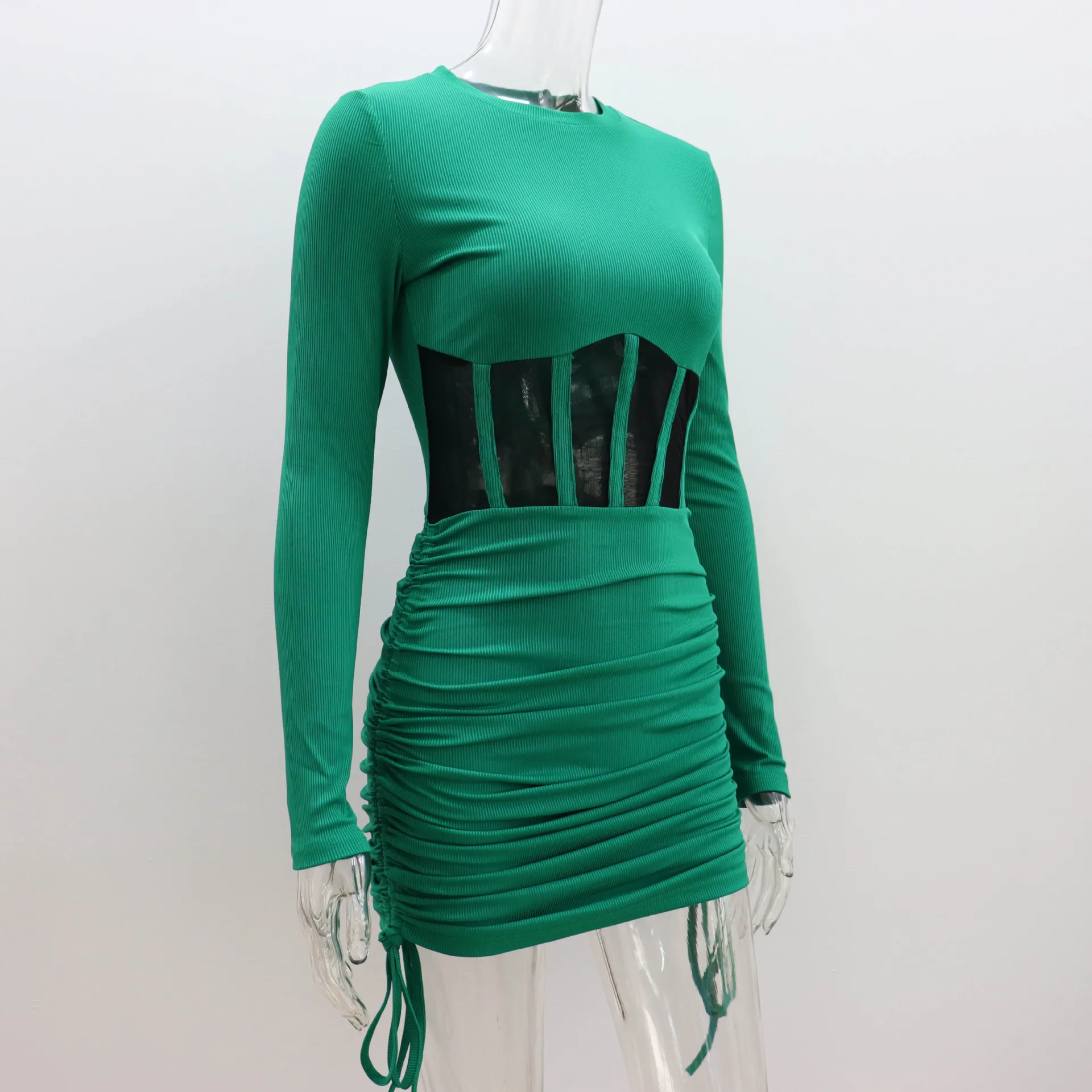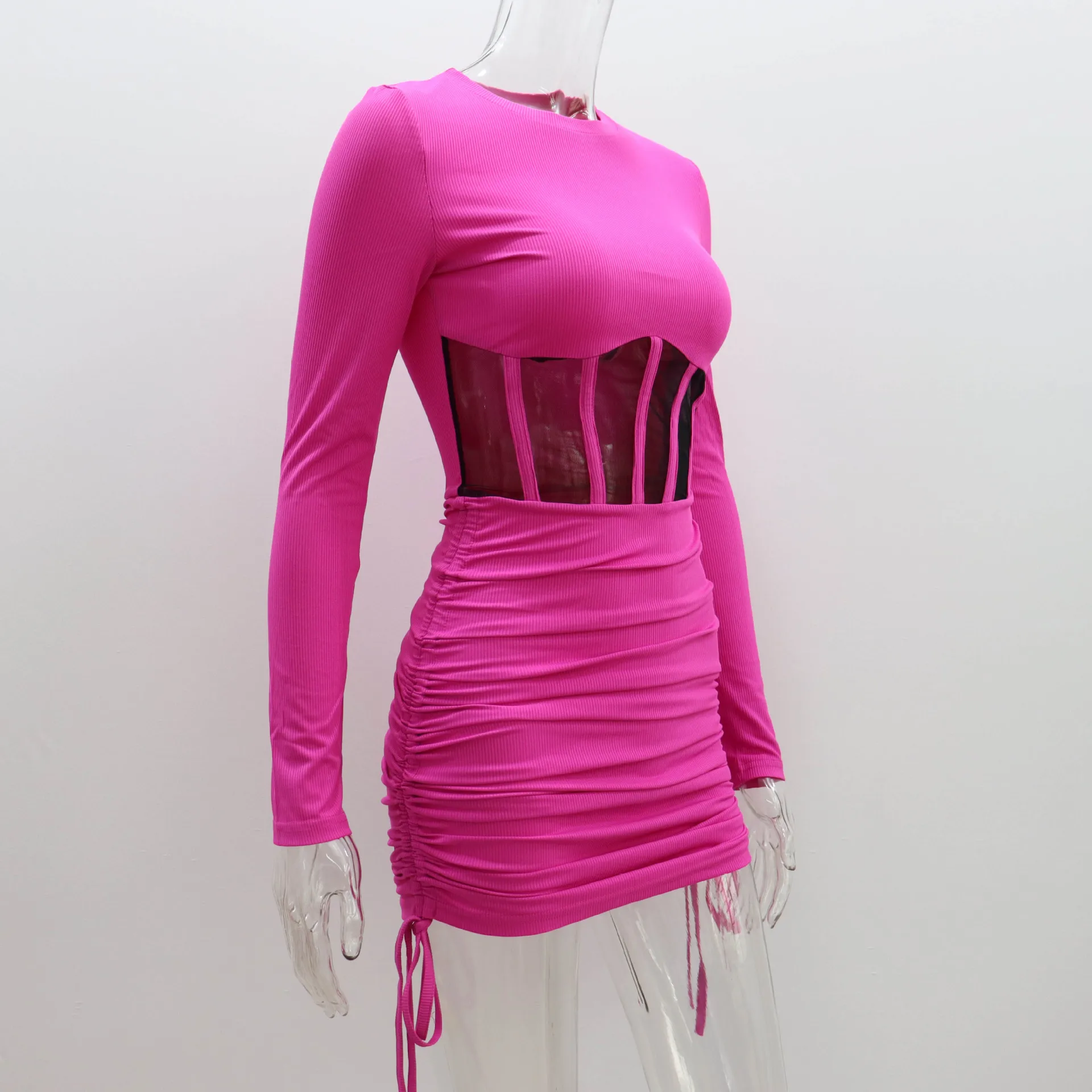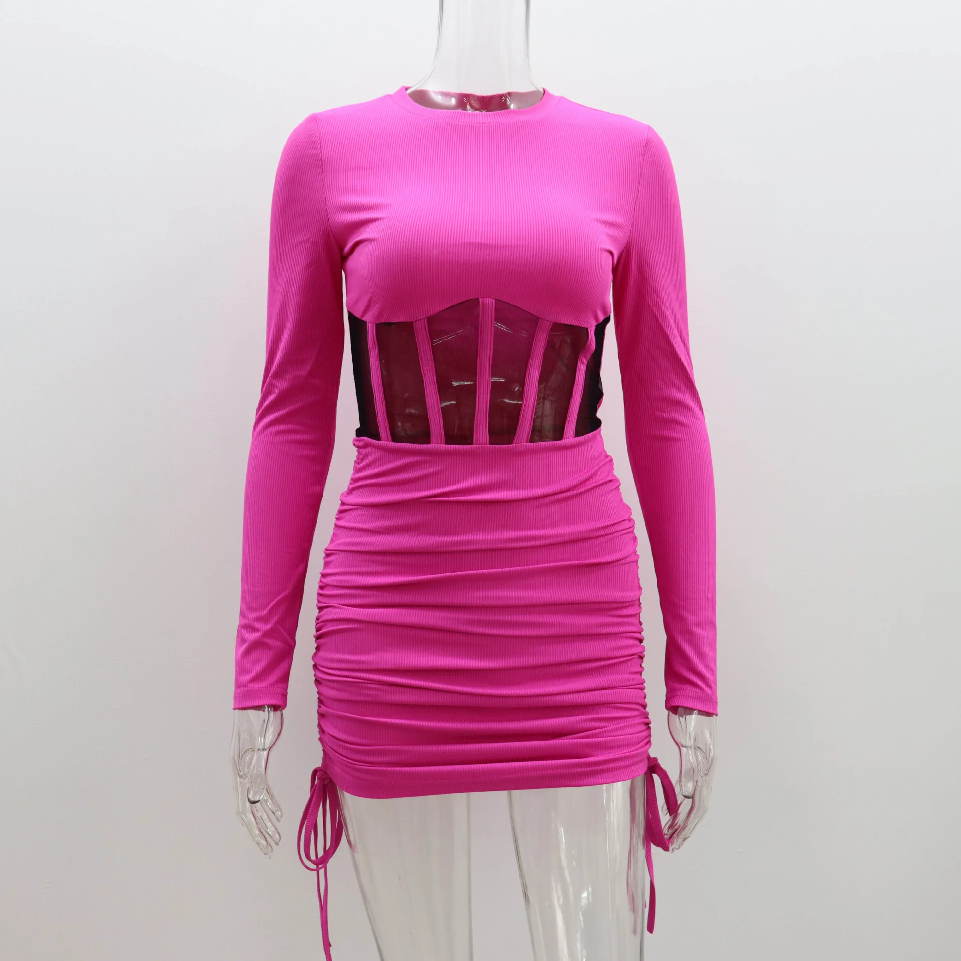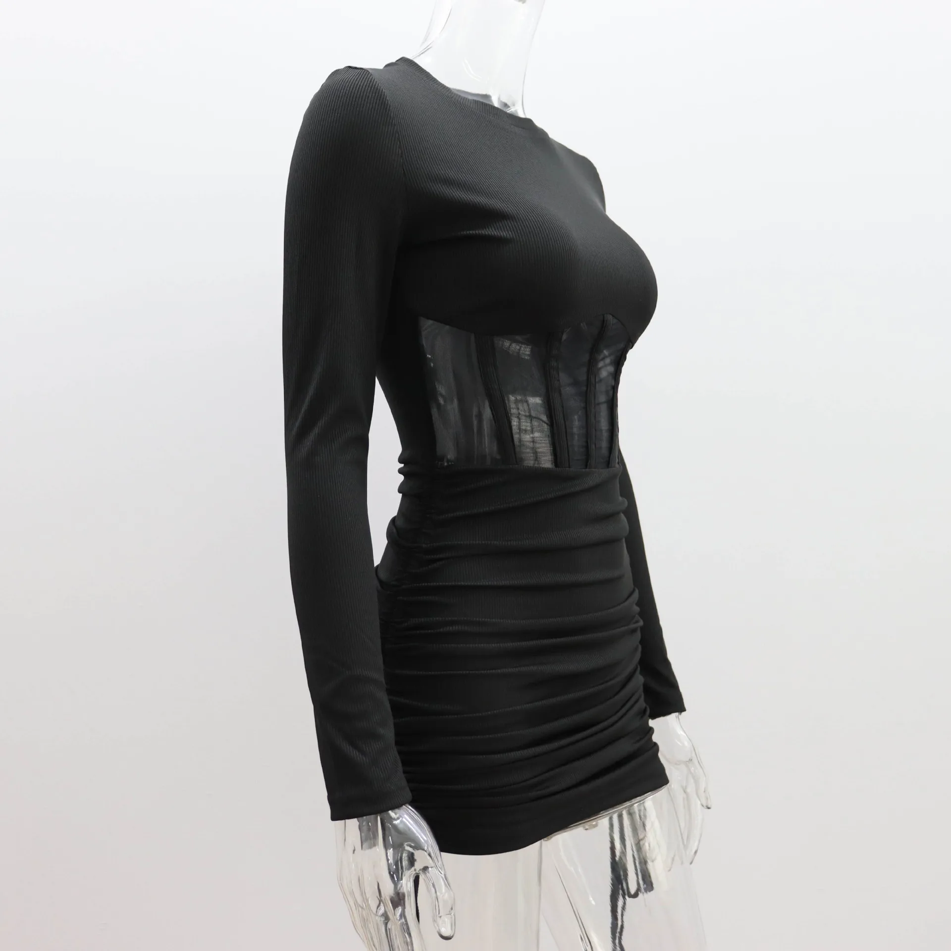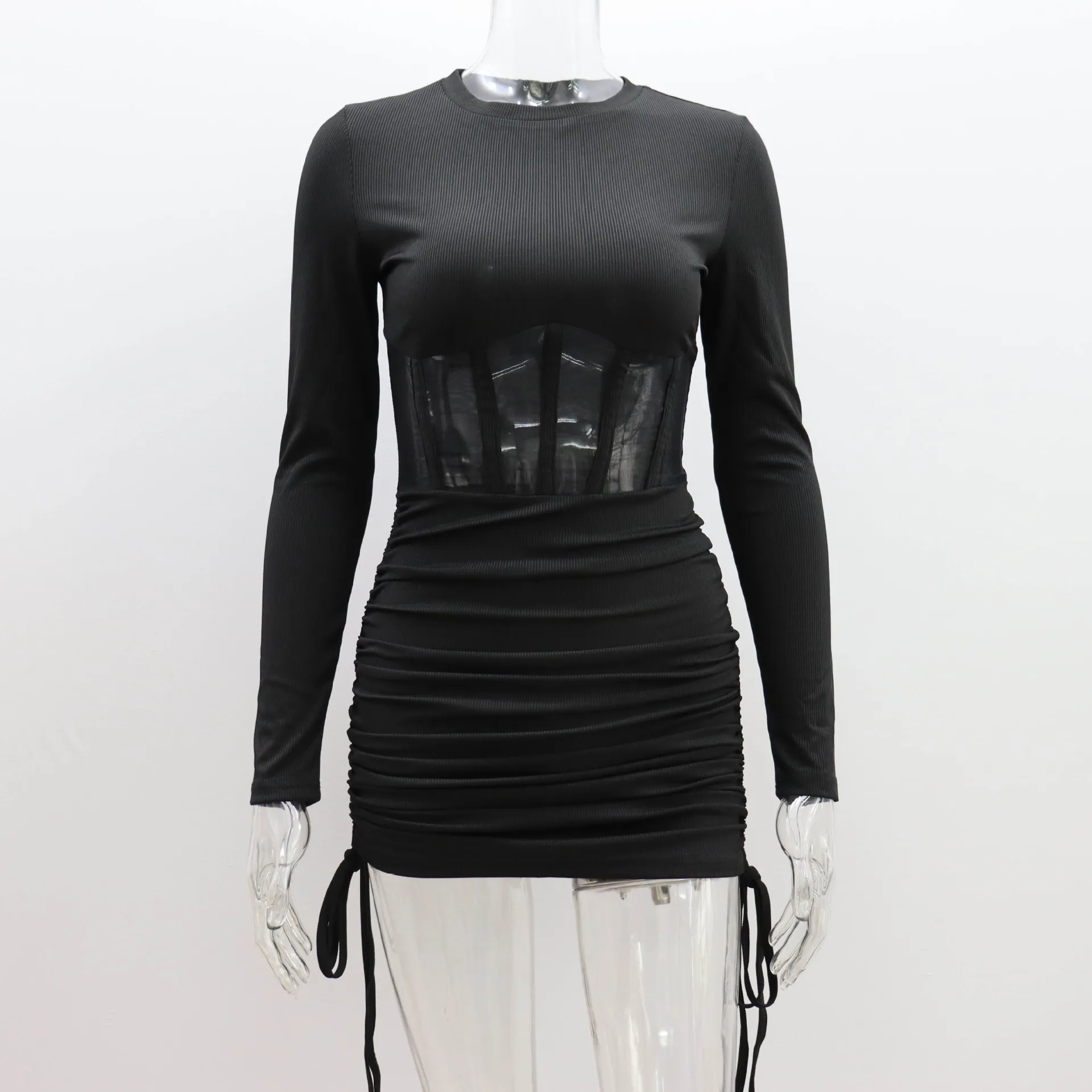 Fleepmart Mesh Hollow Out Bodycon Women O Neck Long Sleeve Mini Ribbed Hot Sexy Dress High Street Wear