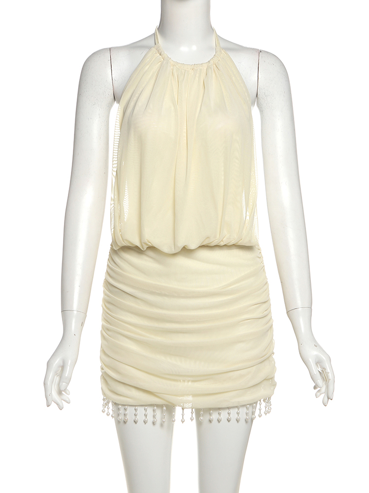 Fleepmart Mesh Patchwork Mini Dress Women Lace-Up Halter Sexy Backless Pearl Tassel Midnight Club Party Ruched Elegant Outfits