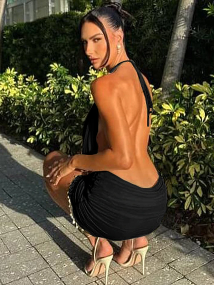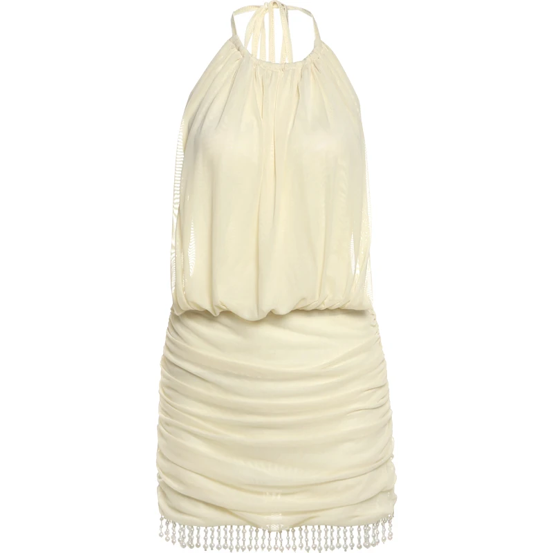 Fleepmart Mesh Patchwork Mini Dress Women Lace-Up Halter Sexy Backless Pearl Tassel Midnight Club Party Ruched Elegant Outfits