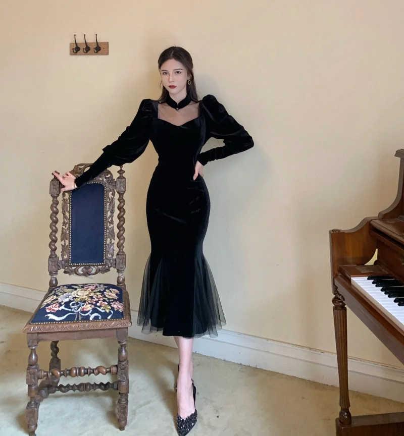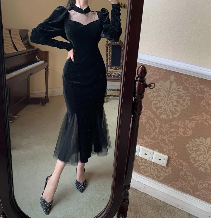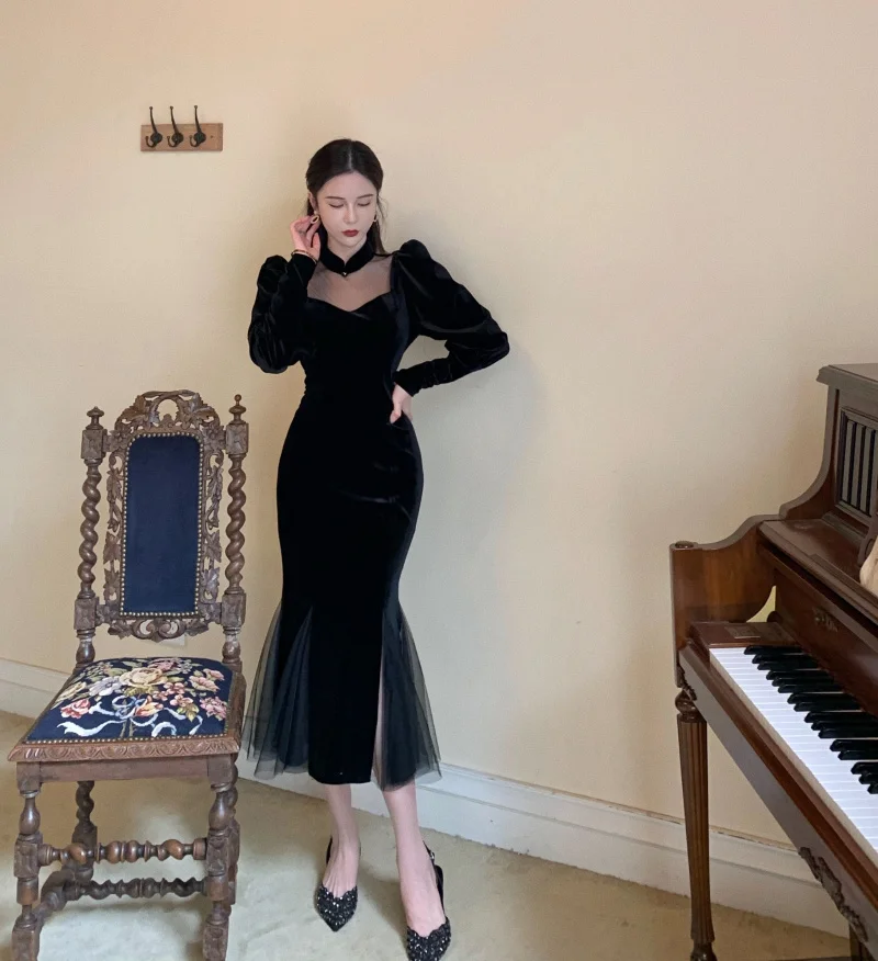 fleepmart Mesh Velvet Black Long Dress Women Vintage Gothic Slim Party Dresses Female Winter Sexy Split Hollow Christmas Dress New