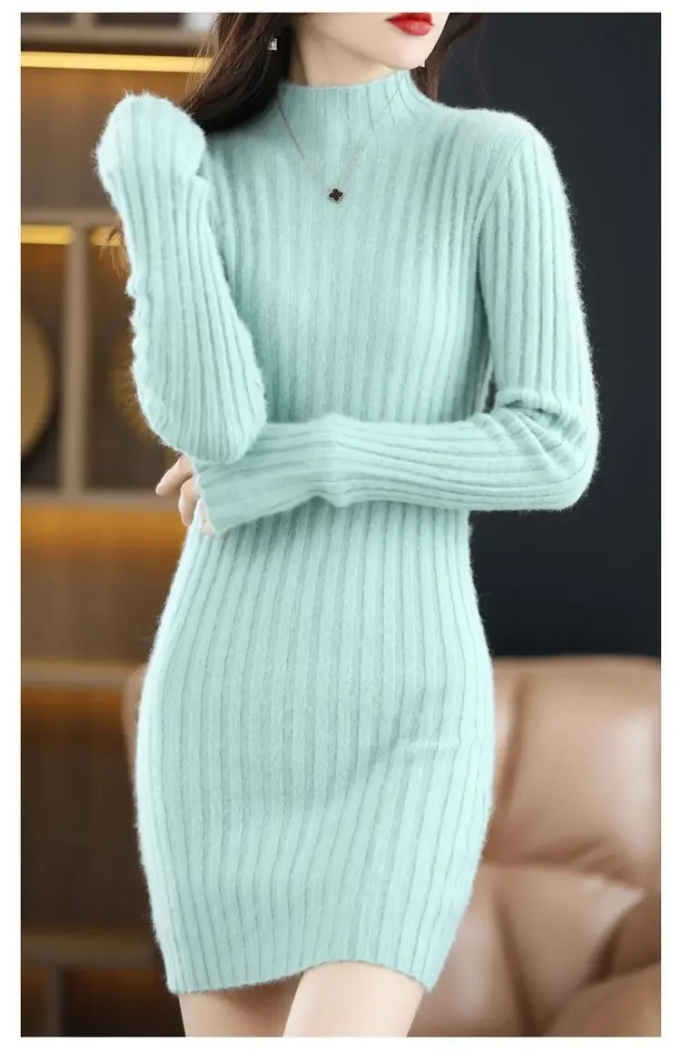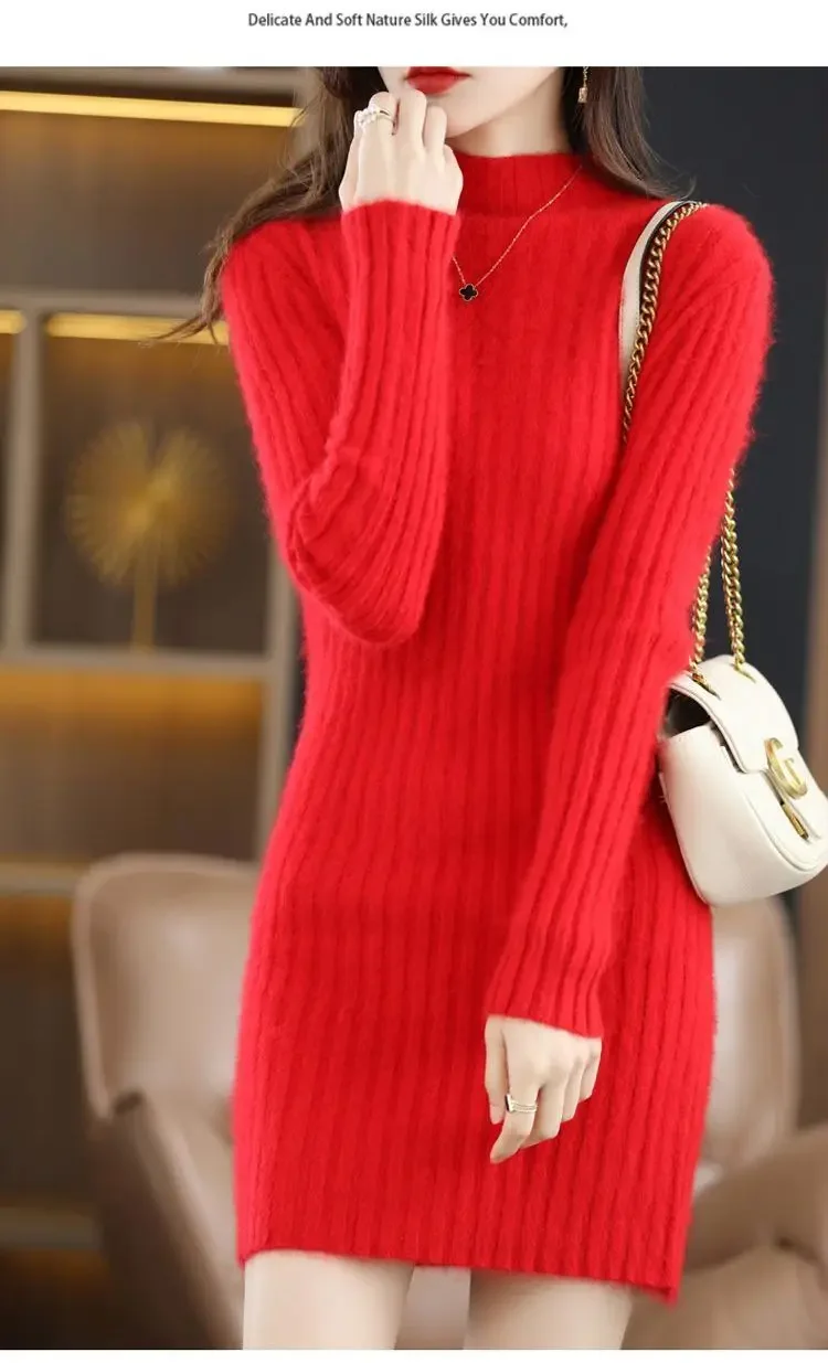 Fleepmart Mink Fur Chic Fashion Sweater Dress Autumn Winter Women Autumn Half High Collar Loose Pullover Korean Knitted Dresses