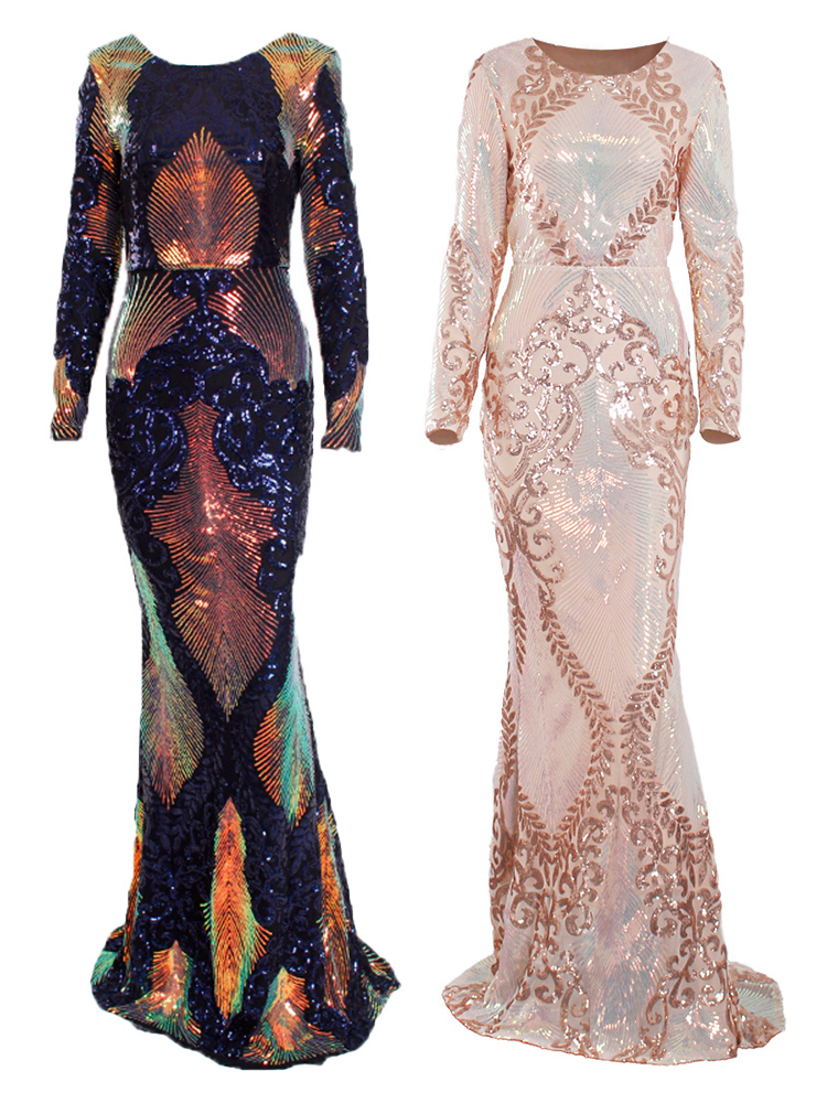 Fleepmart Multicolor Stretchy Sequin Party Dress Long Sleeve O Neck Bodycon Floor Length Full Lining Geometric Formal Gown