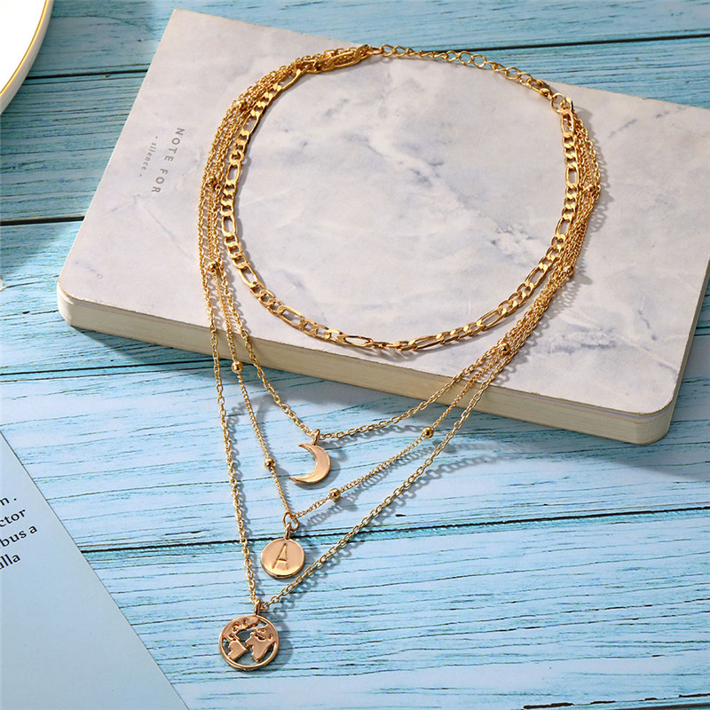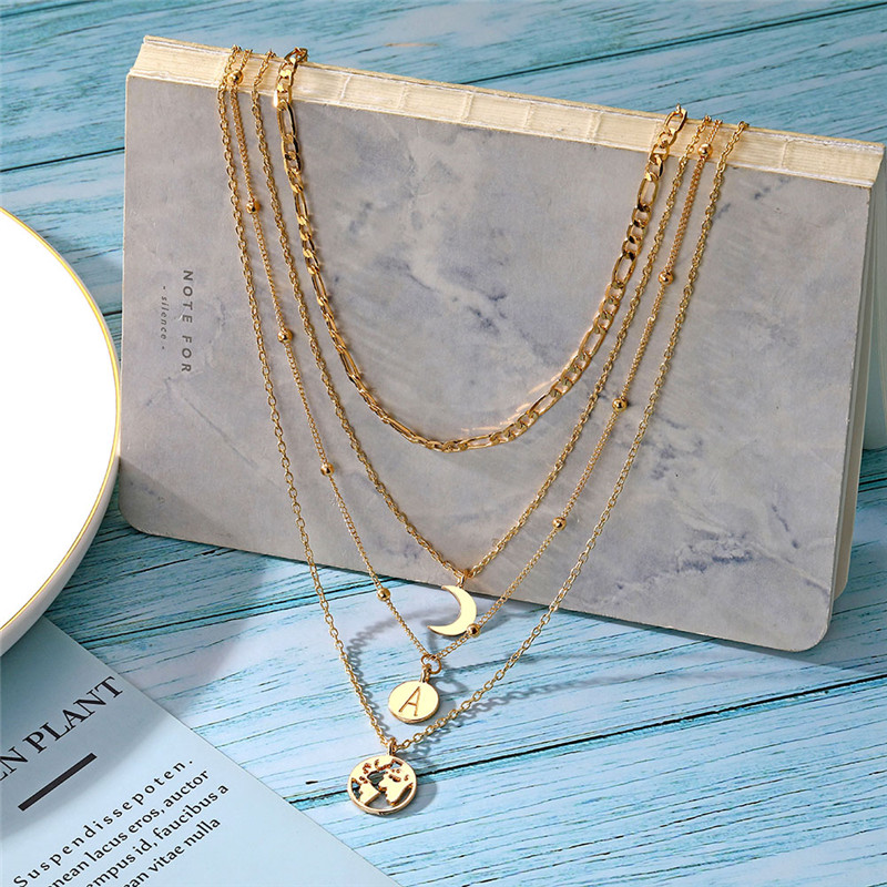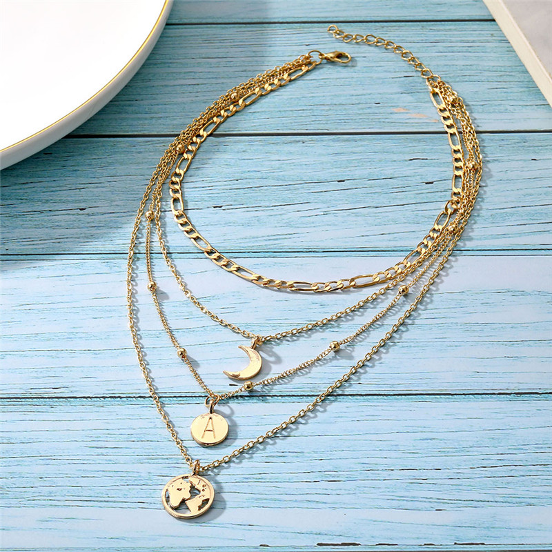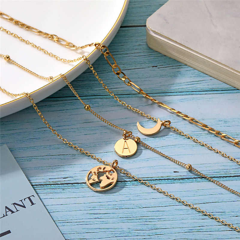Fleepmart Multilayer Moon Map Pendant Necklace For Women Gold Color Round Circle Letter Chain Choker Necklaces Jewelry Party Gift New