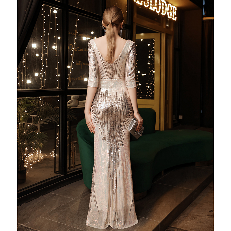 Fleepmart New 2021 Women See Through Half Sleeve Gold Sequin Evening Dress Slit Party Dress Long Prom Dress