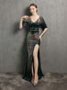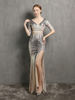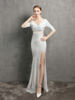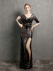 Fleepmart New 2021 Women See Through Half Sleeve Gold Sequin Evening Dress Slit Party Dress Long Prom Dress
