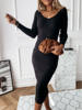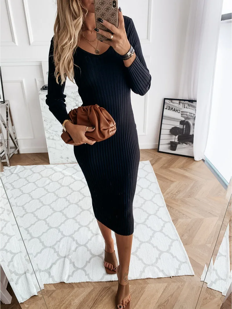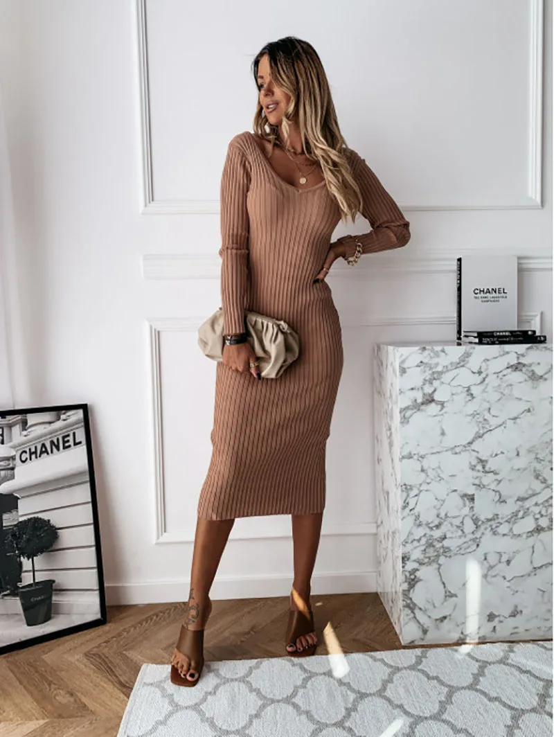 Fleepmart New 2025 Spring Women’s Dress Long Sleeve V Neck Low Cut Thread Tight Party Khaki Fashion Basic Long Skirt