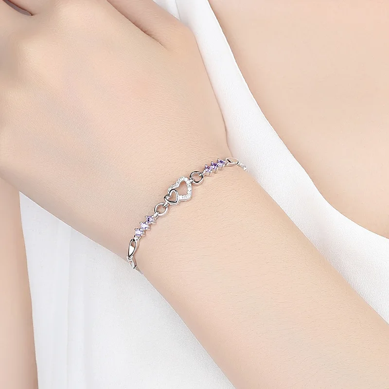 Fleepmart New 925 Sterling Silver Bracelet Purple Crystal Zircon Heart For Woman Charm Bracelet Jewelry Gift