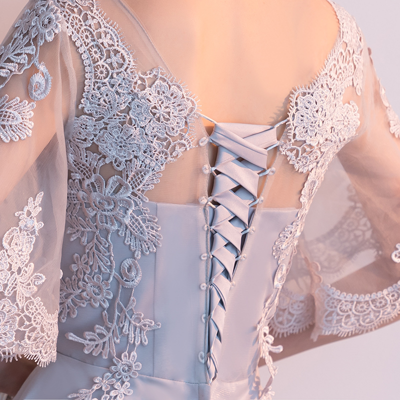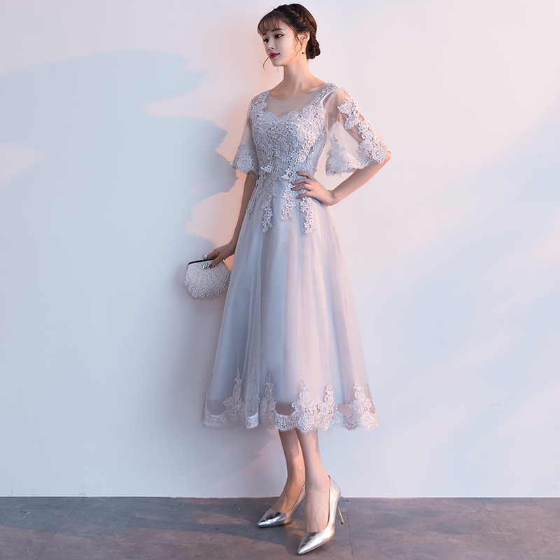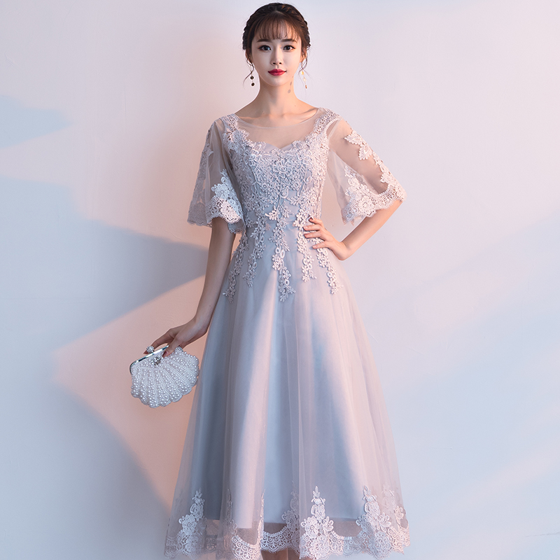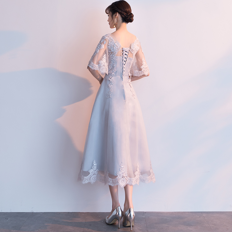 Fleepmart New Arrival Gery Luxury O-Neck Half Sleeve Embroidery Lace up Evening Dresses A-line Tea Length Formal Dress