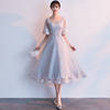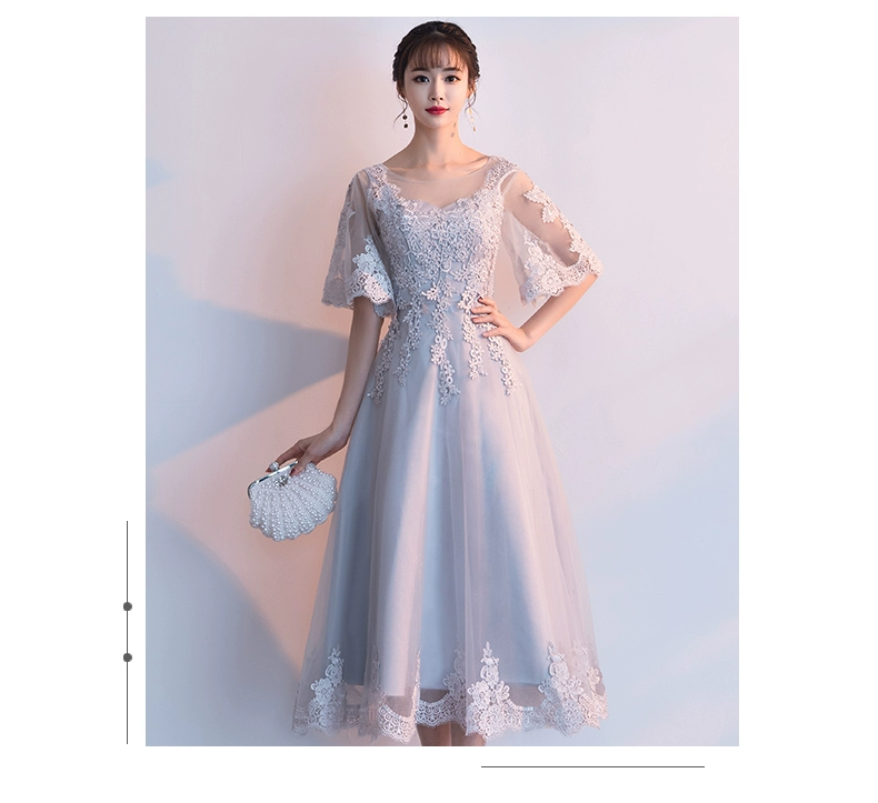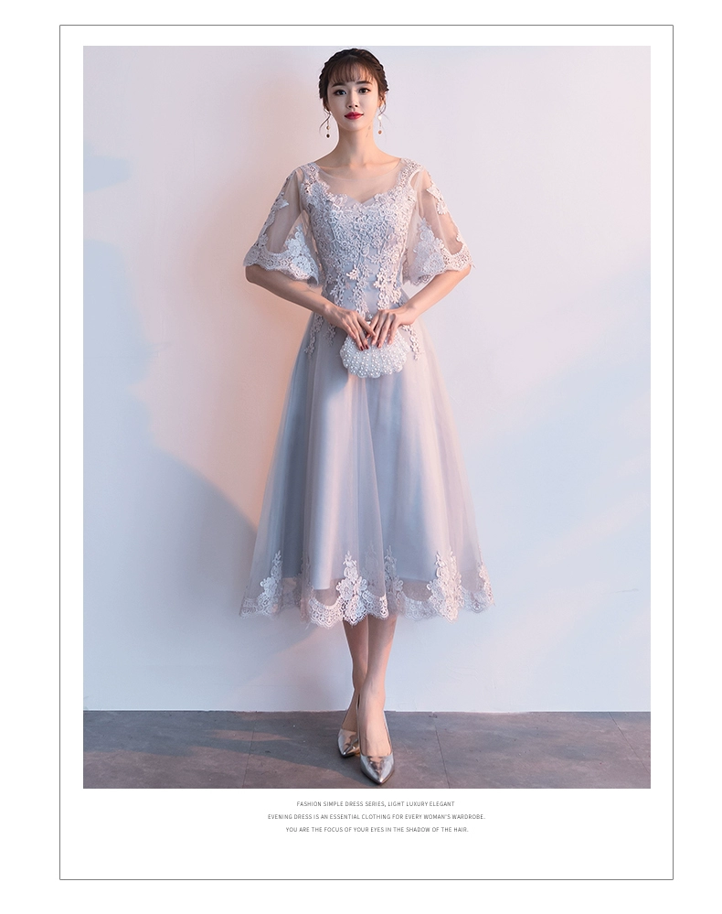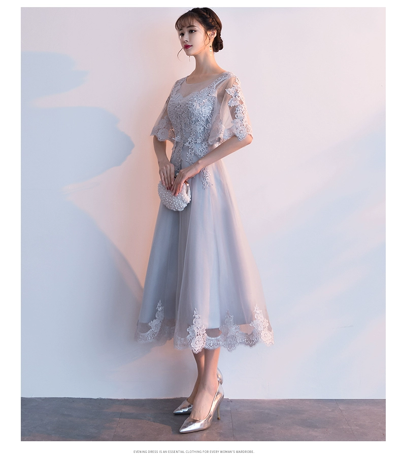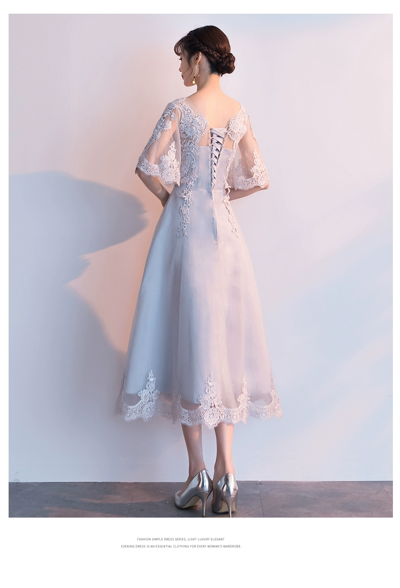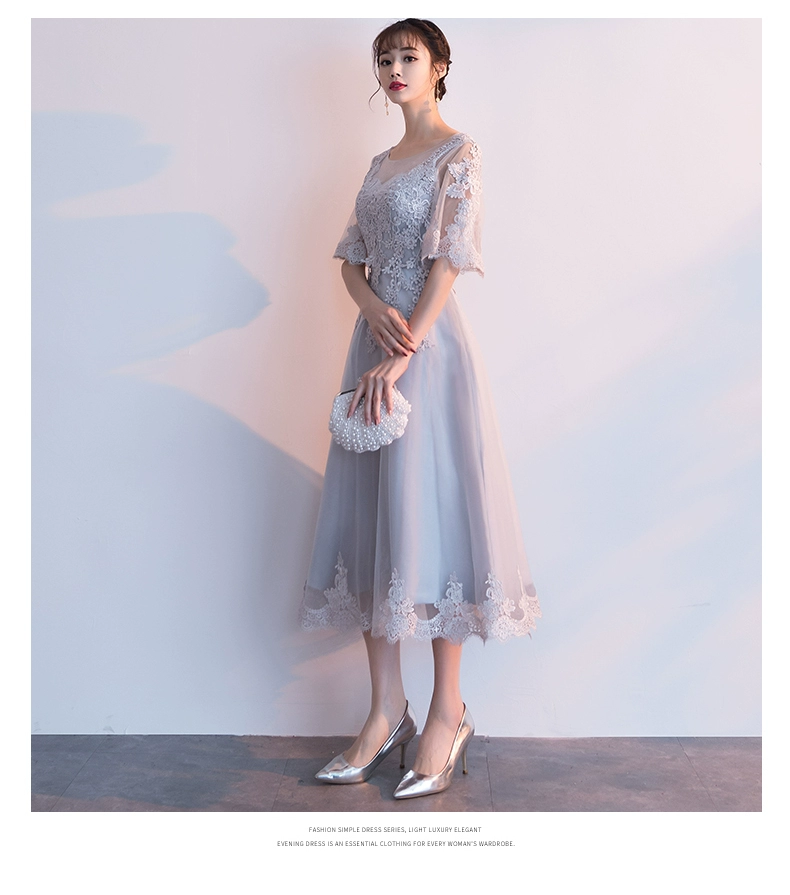 Fleepmart New Arrival Gery Luxury O-Neck Half Sleeve Embroidery Lace up Evening Dresses A-line Tea Length Formal Dress