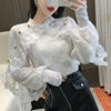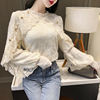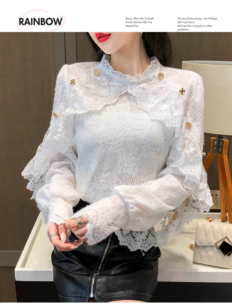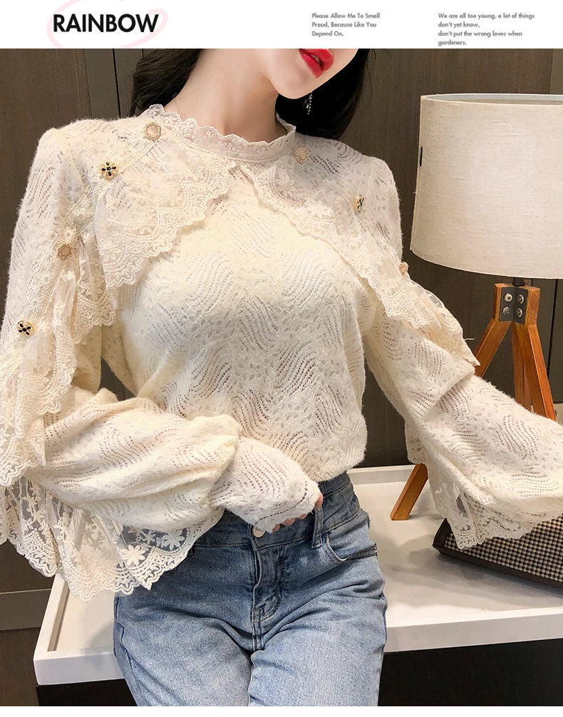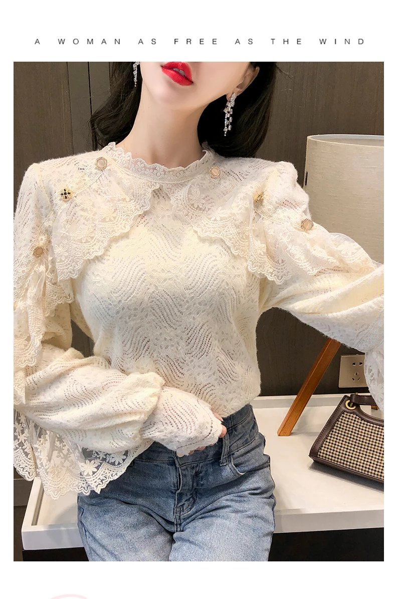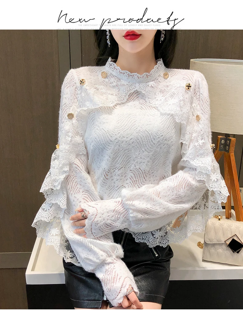 Fleepmart New Crochet Lace Blouse Women Chic Ruffle Lace Stitching Shawl Ladies Stand Collar Tops 2022 Spring Long Sleeve Slim Shirt