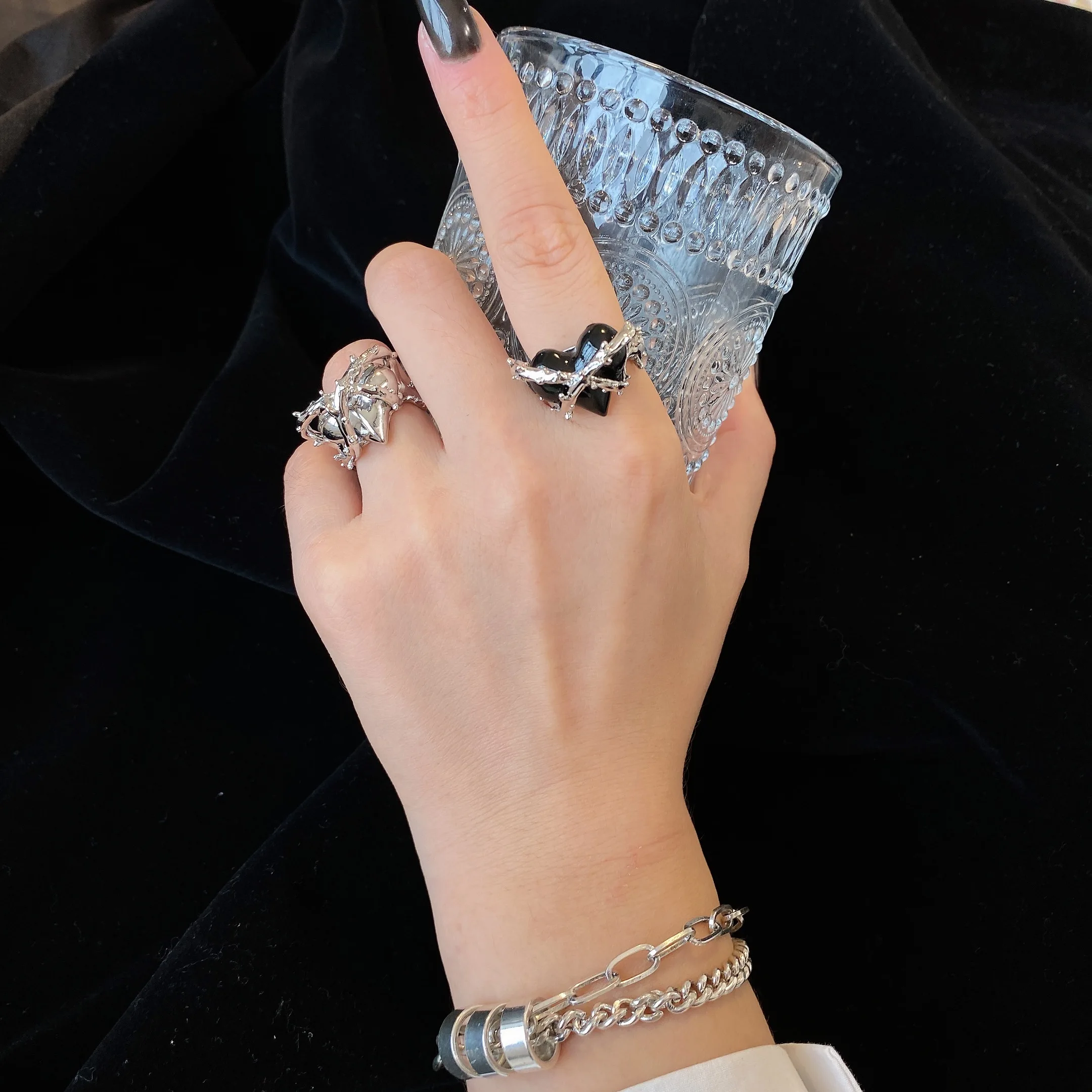 Fleepmart New Design Punk Gothic Thorns Black Silver Color Heart Metal Opened Rings For Women Girls Party Adjustable Jewelry