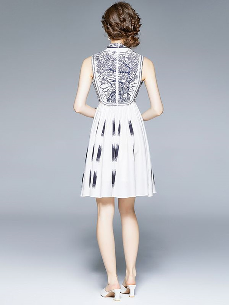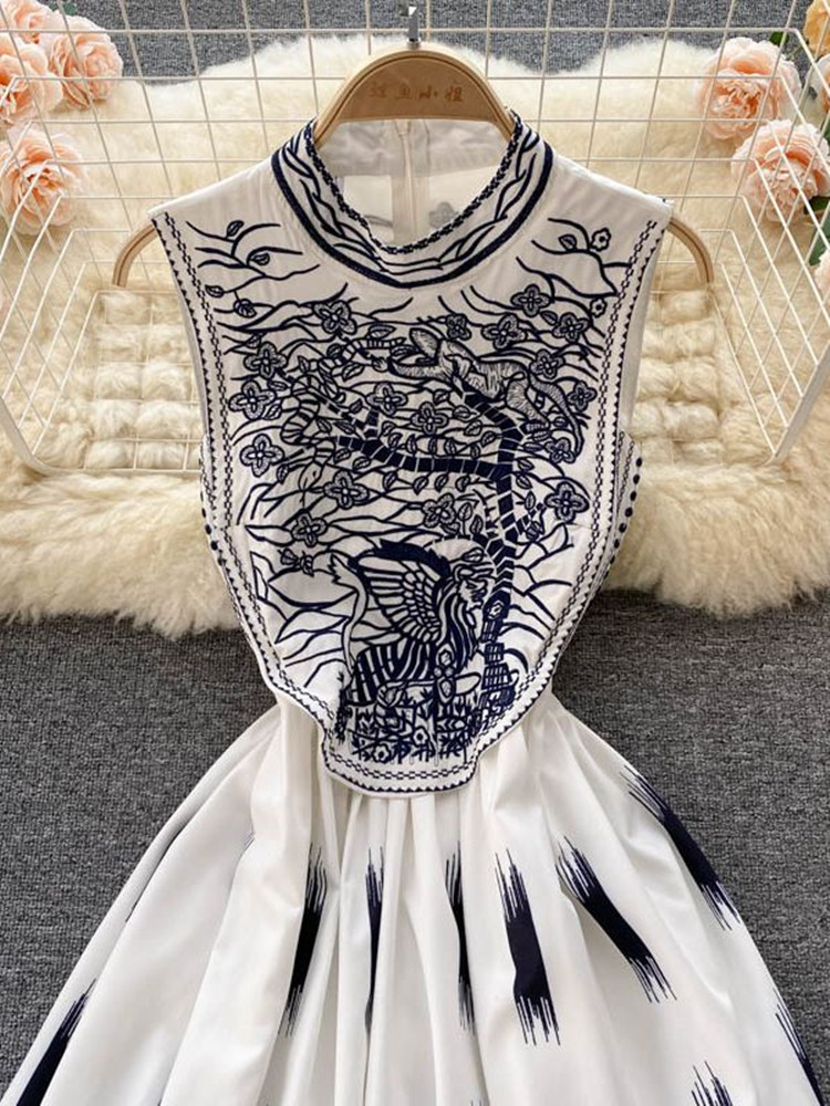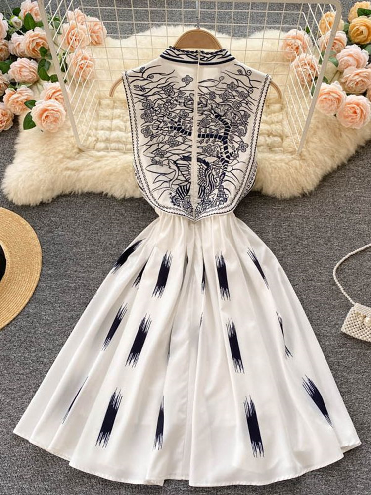 fleepmart New Fashion Runway Summer Dress Women’s Sleeveless Stand Collar Floral Embroidery Elegant High Waist Zipper Mini Vestidos