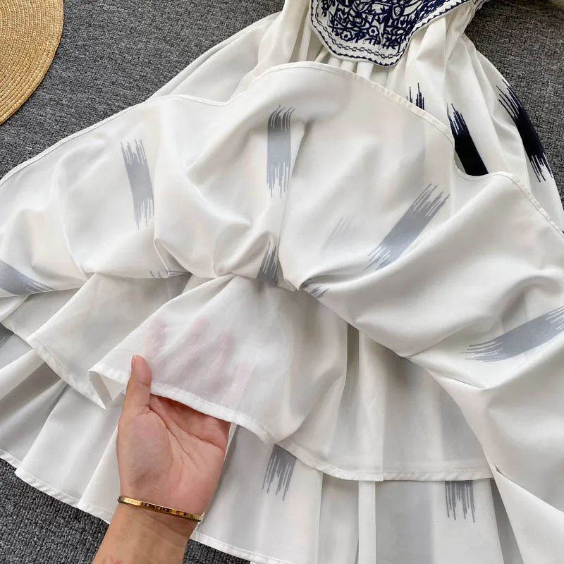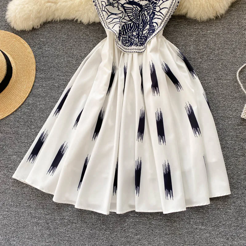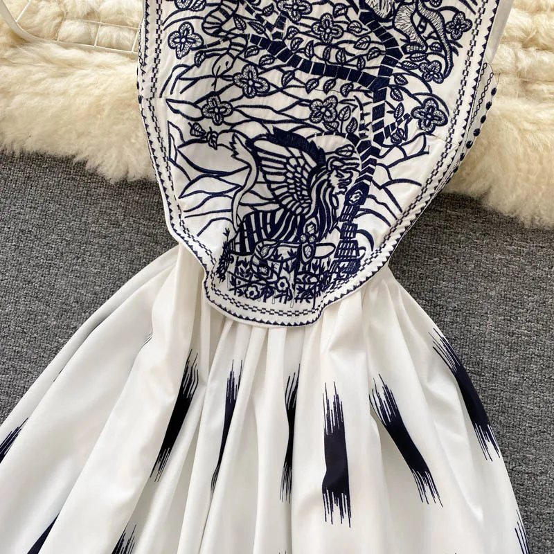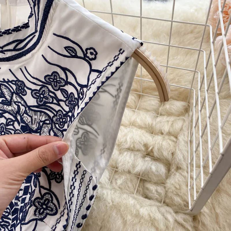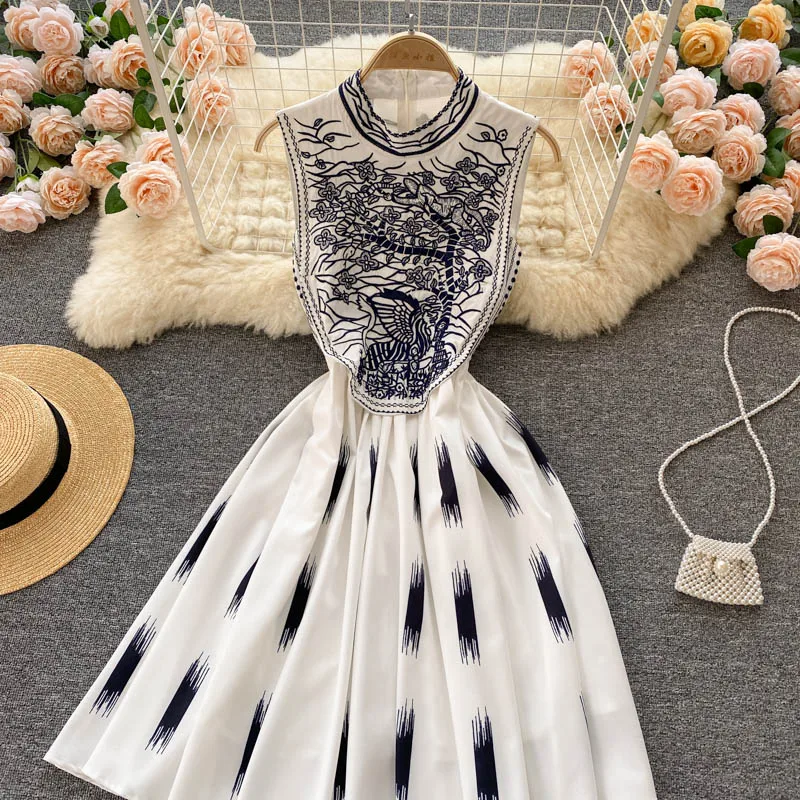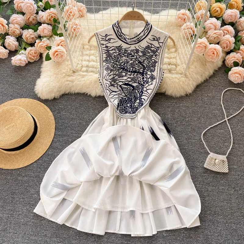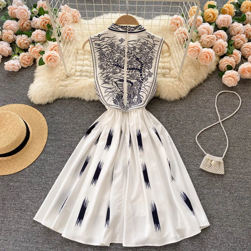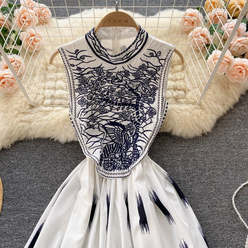 fleepmart New Fashion Runway Summer Dress Women’s Sleeveless Stand Collar Floral Embroidery Elegant High Waist Zipper Mini Vestidos