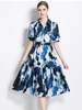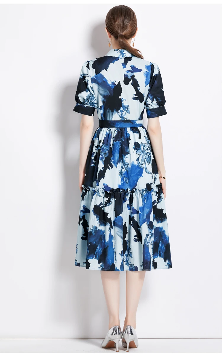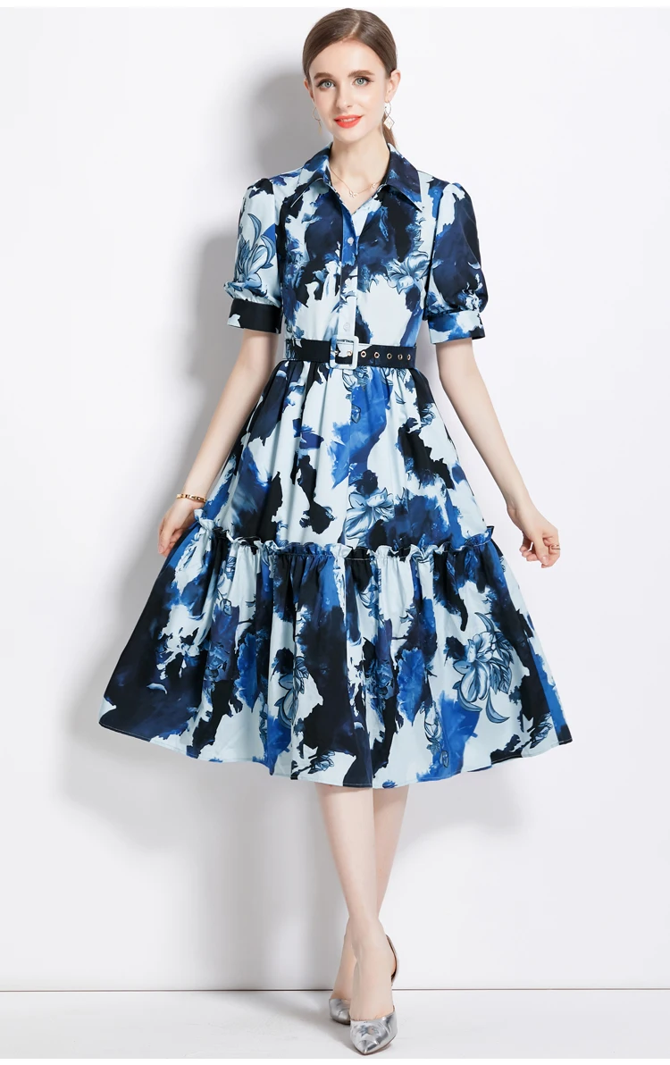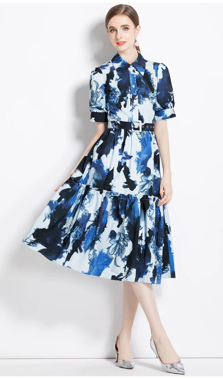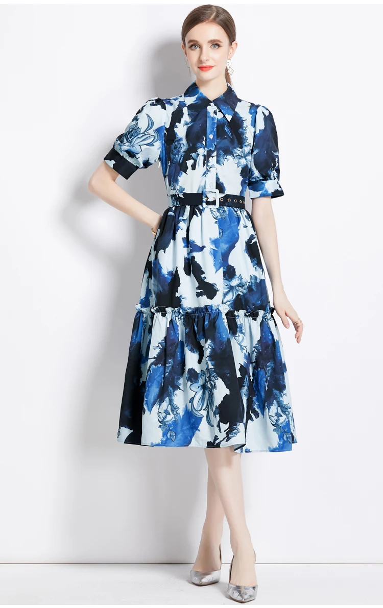 Fleepmart New Fashion Women’s Lapel Short Sleeve Slim A-line Mid-length Summer Dress Vintage Print Belts Shirt Dress