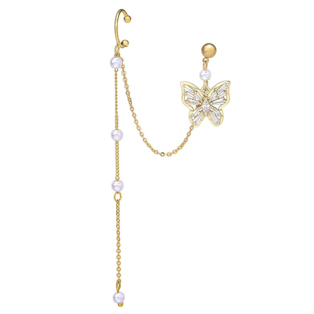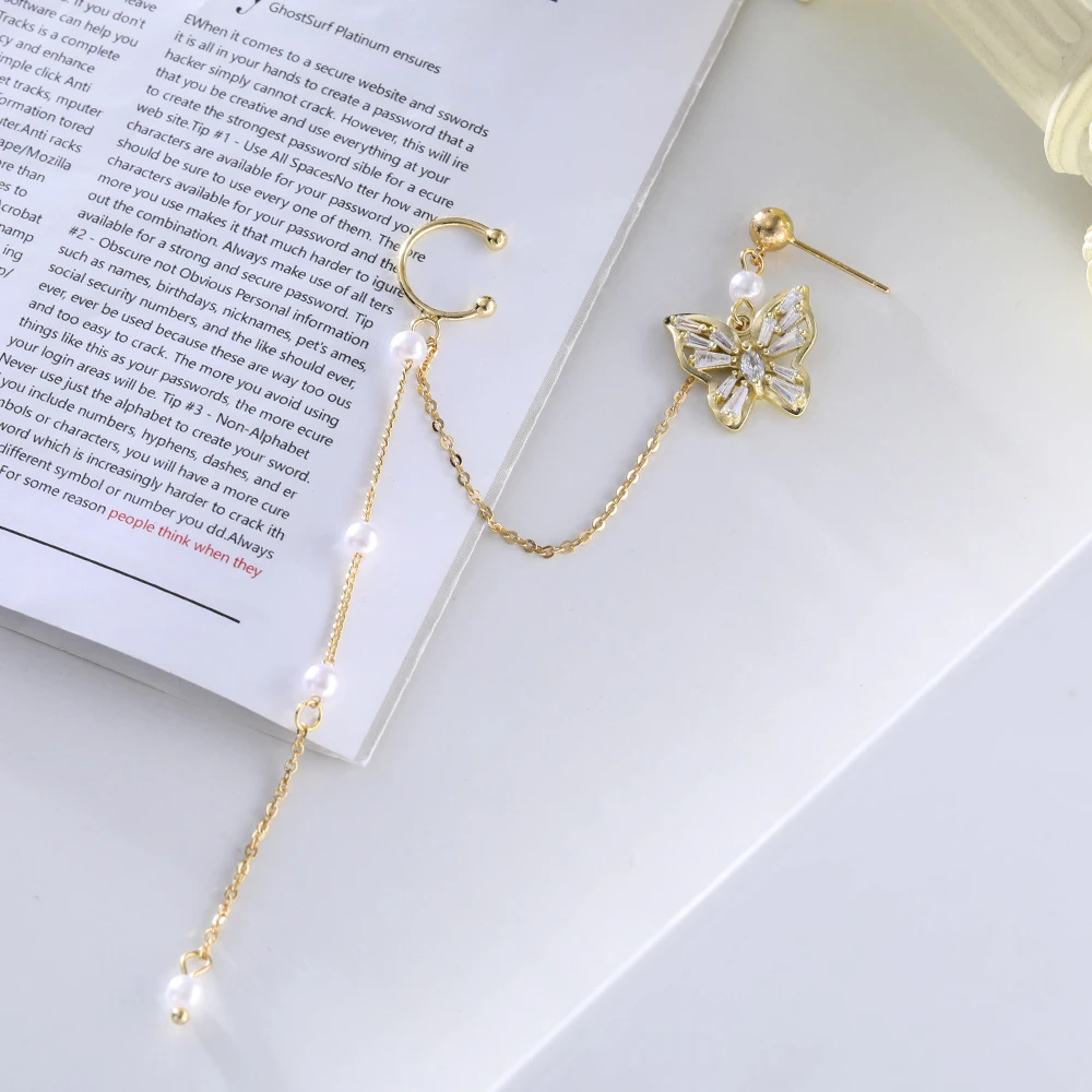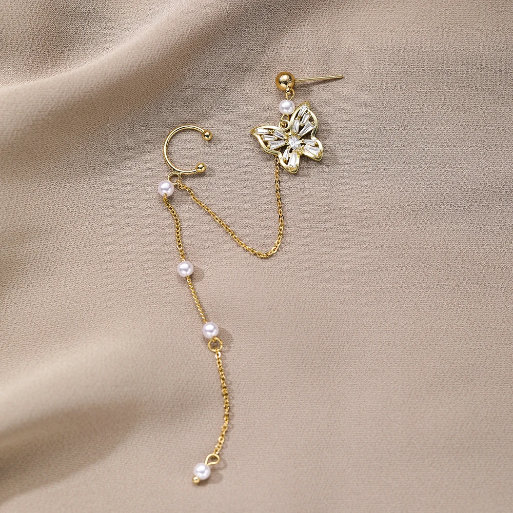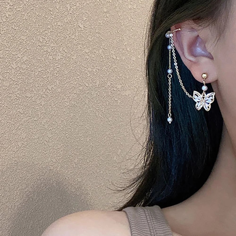 Fleepmart New Korean Butterfly Ear Clip Earrings Fashion Rhinestone Pearl Chain Drop Earrings for Women 2022 Wedding Jewelry Wholesale