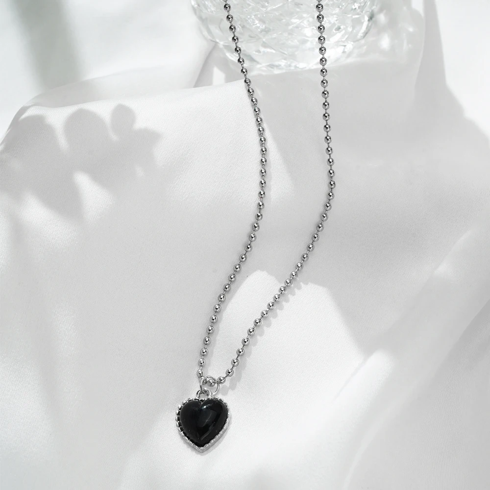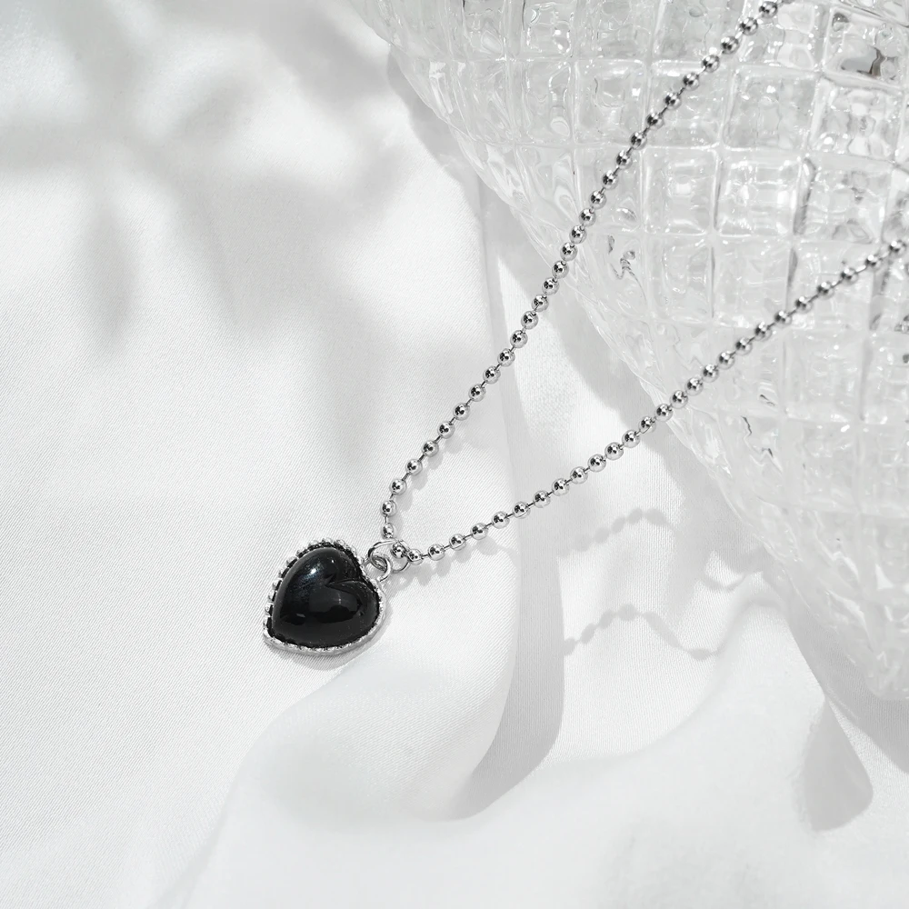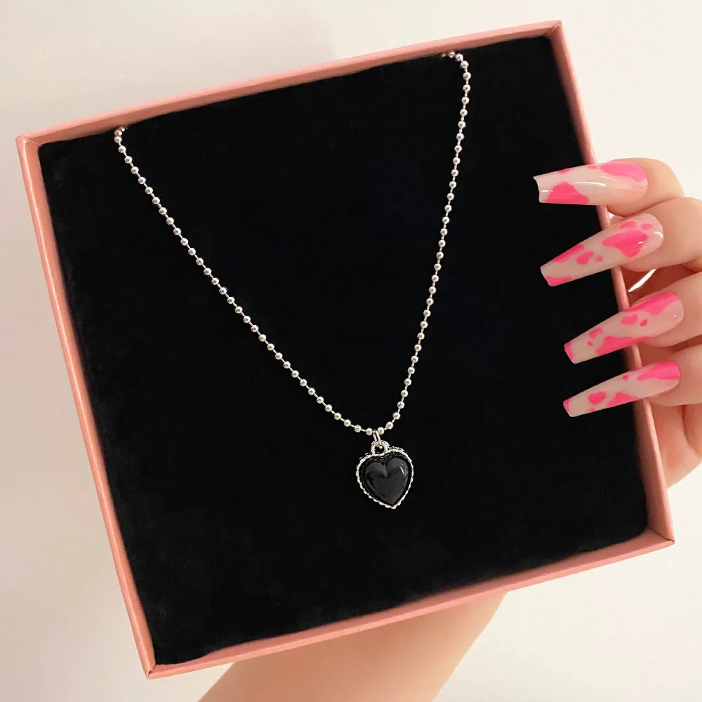 Fleepmart New Korean Silver Color Necklace for Women Beaded Chain Black Heart Pendant Simple Choker Necklaces Fashion Jewelry