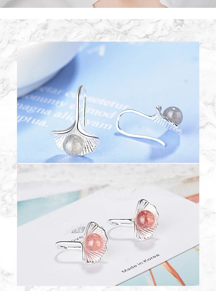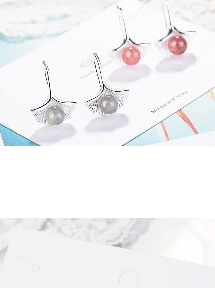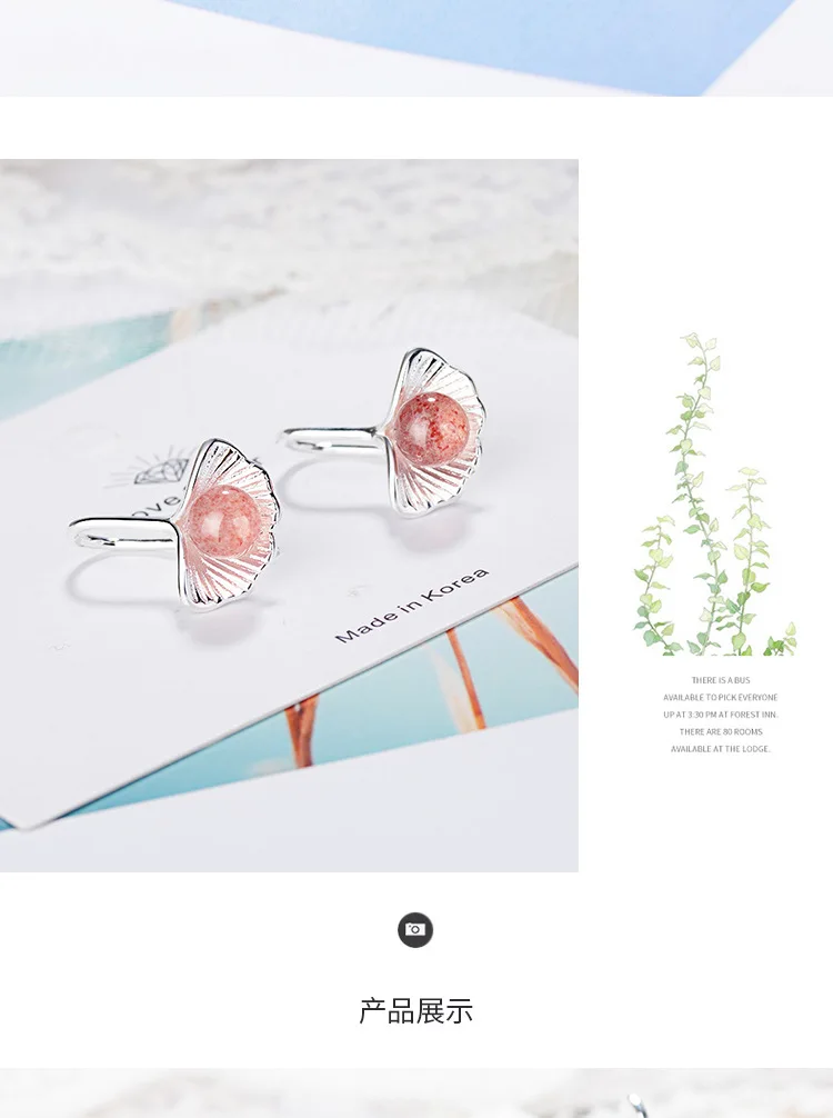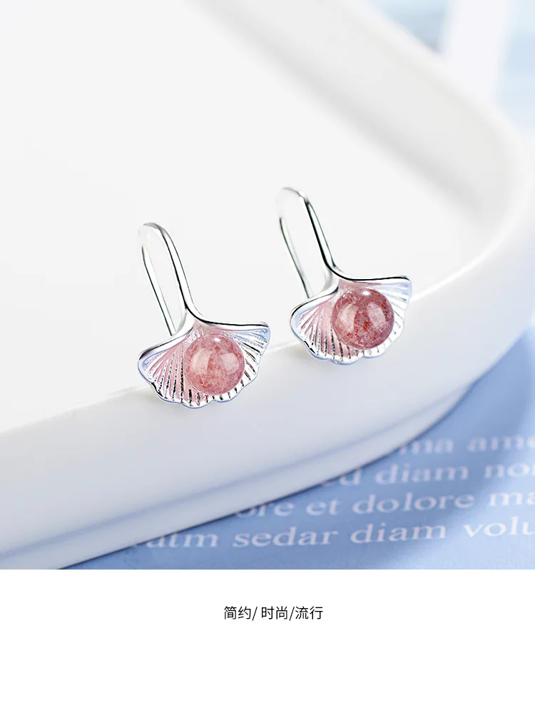 Fleepmart New Natural Creative Ginkgo Biloba Strawberry Crystal Silver Plated Jewelry Pink Ear Hook Design Dangle Earrings