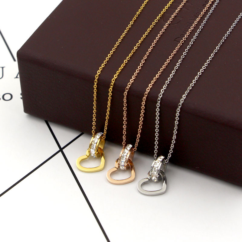 Fleepmart New peach heart Shuanghuan crystal short necklace female models fashion heart buckle ultra-flash titanium steel necklace jewelry