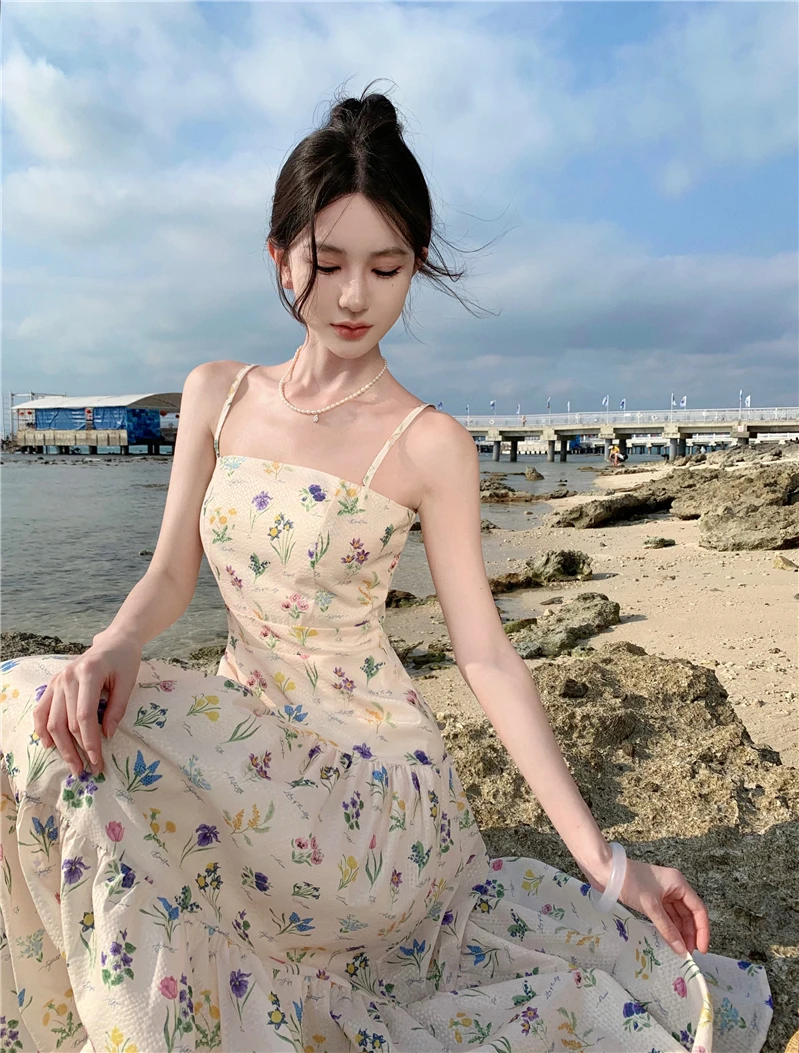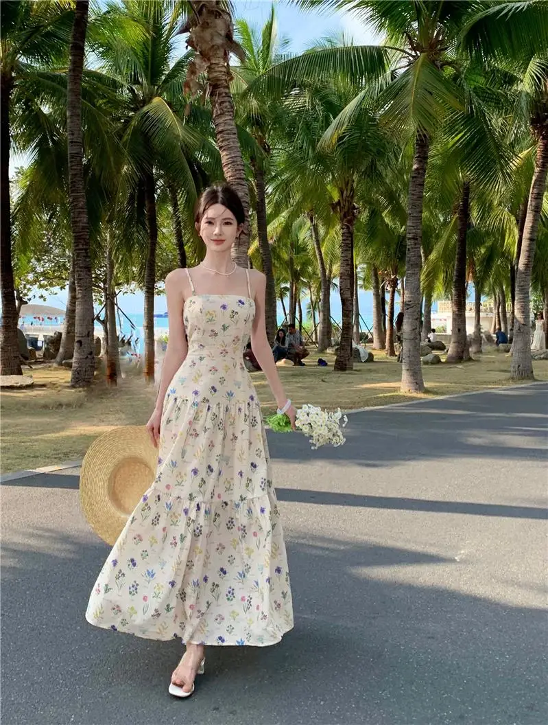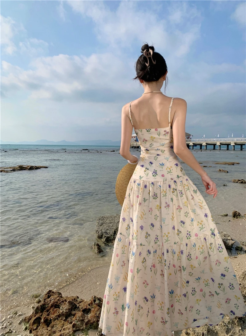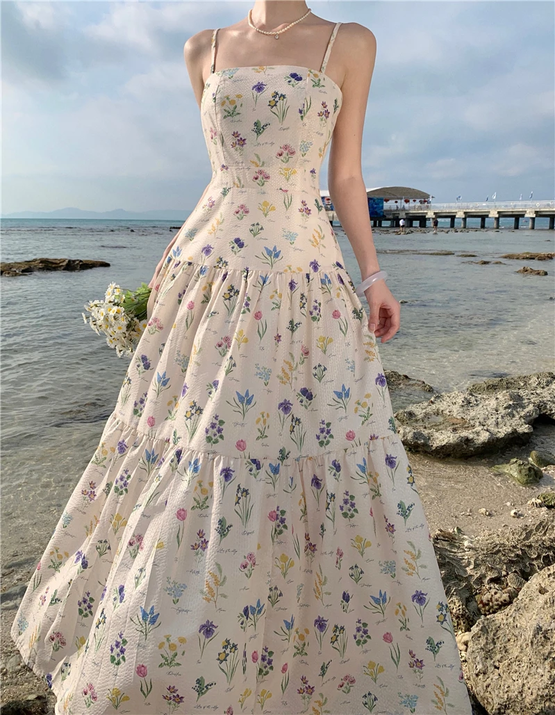 Fleepmart New Spaghetti Strap Elegant Women Summer Dress Sleeveless Vintage A-Line Floral Print Midi Party Beach Robe Female Slim Vestidos