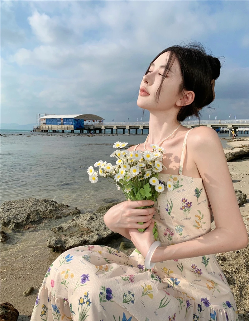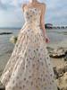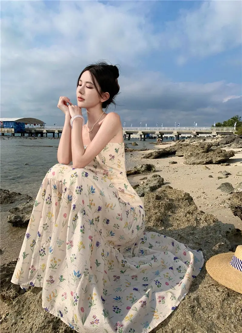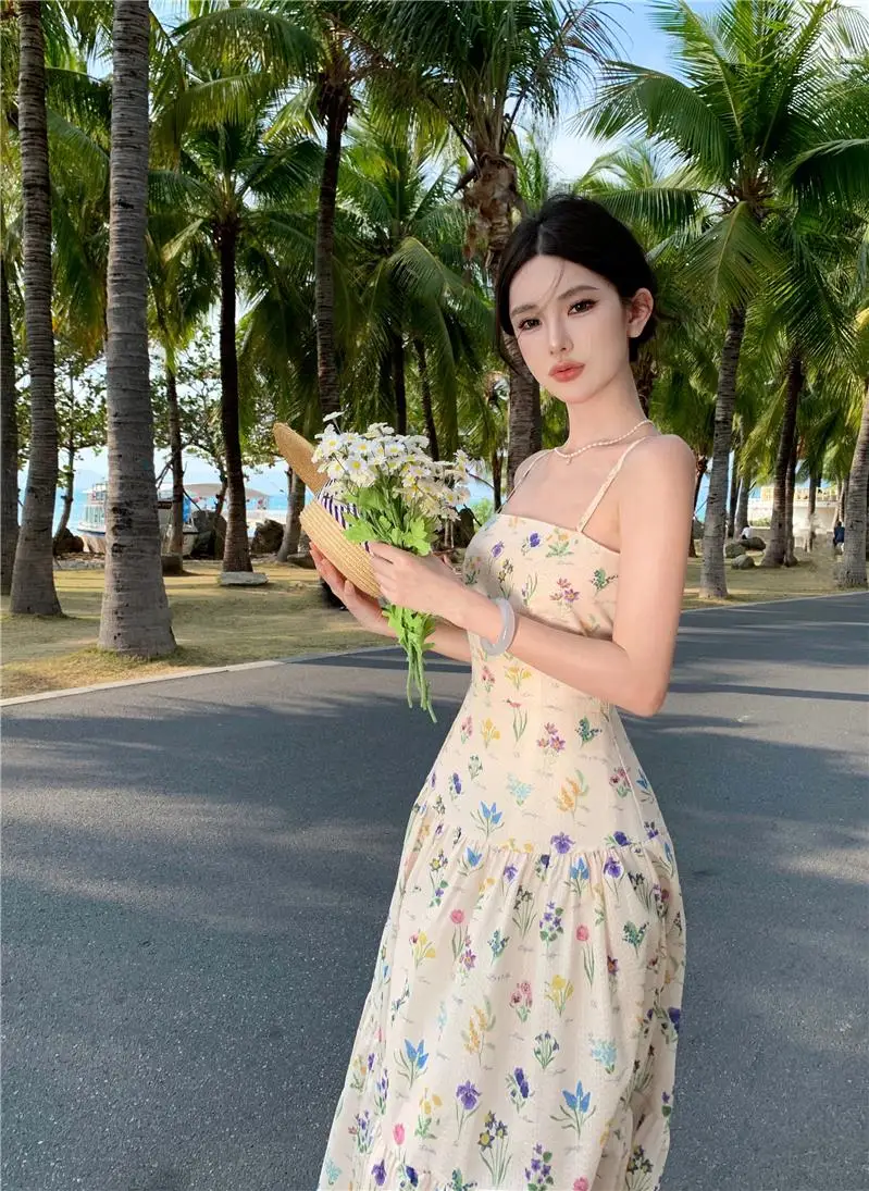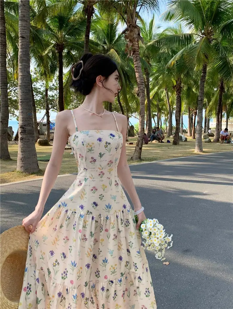 Fleepmart New Spaghetti Strap Elegant Women Summer Dress Sleeveless Vintage A-Line Floral Print Midi Party Beach Robe Female Slim Vestidos