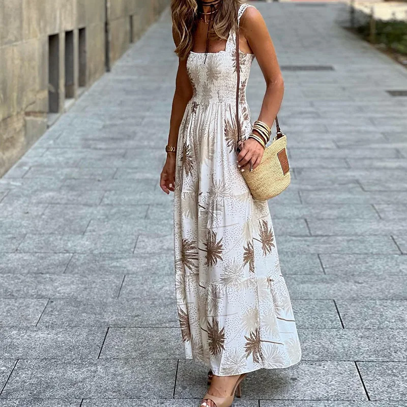 Fleepmart New Spring Maple Leaf Print Long Party Dress Women Sexy Slash Neck Draped Maxi Dress Summer Off Shoulder Strap Office Lady Dress