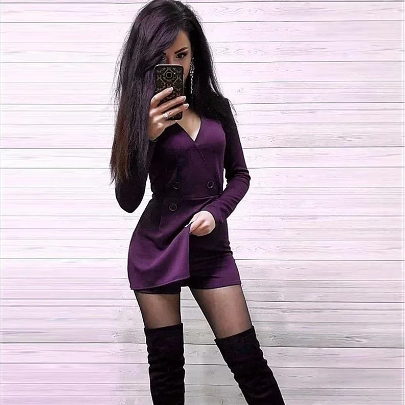 Fleepmart New Spring Women V-Neck Short Suit Jumpsuit Slim Fit Buttons Long Sleeve Dress Party Dress