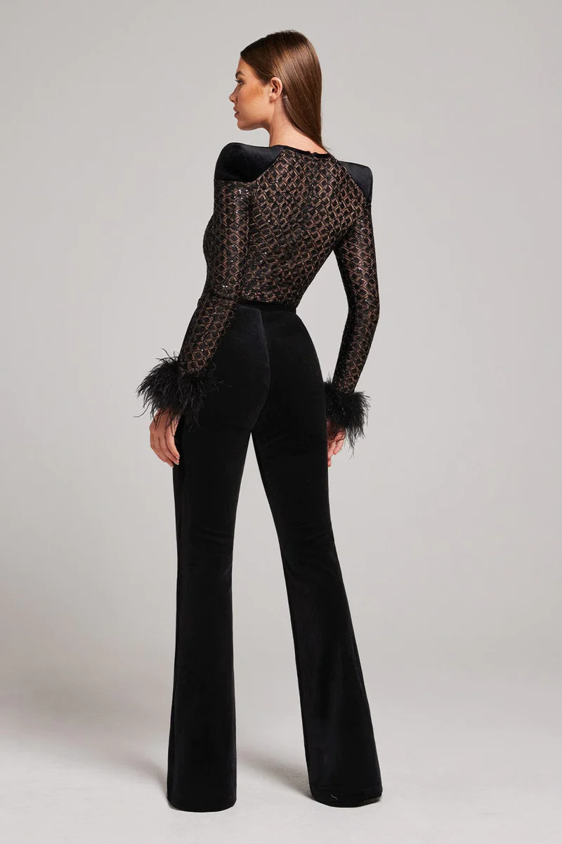 Fleepmart New Style Women Long Sleeve Sexy Feathers Bodycon Bandage Jumpsuit Fashion Elegant Evening Party Celebrate Jumpsuit