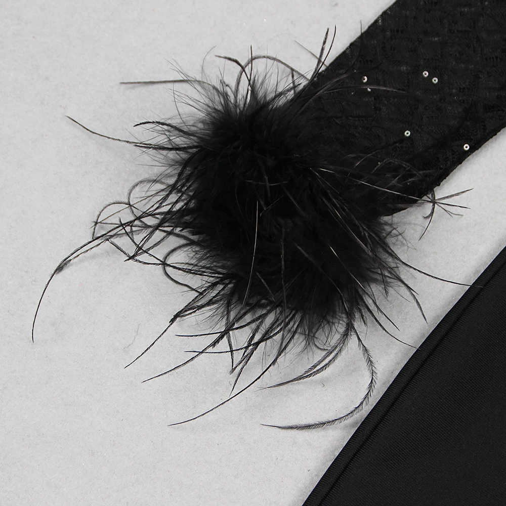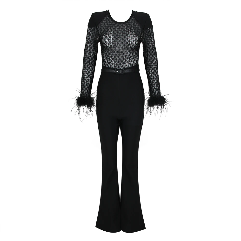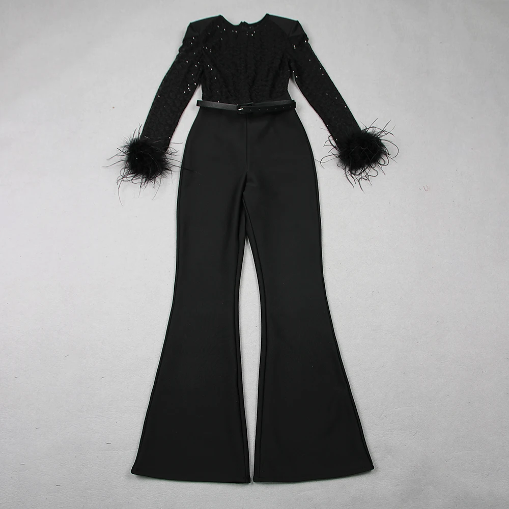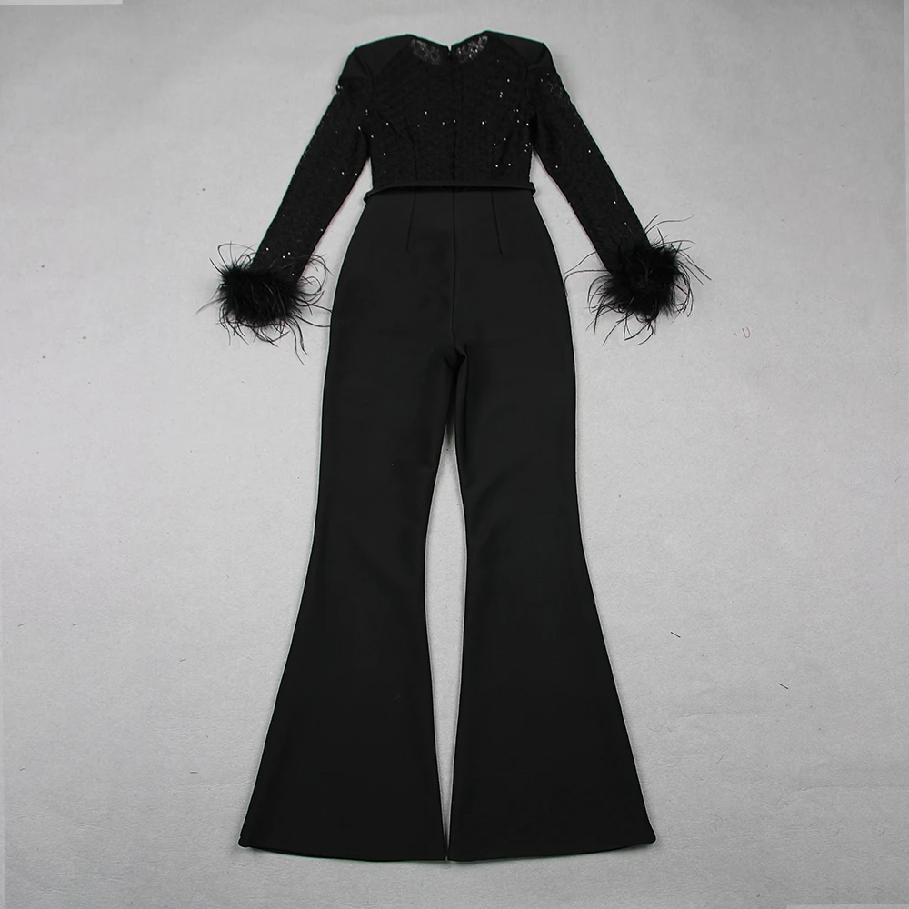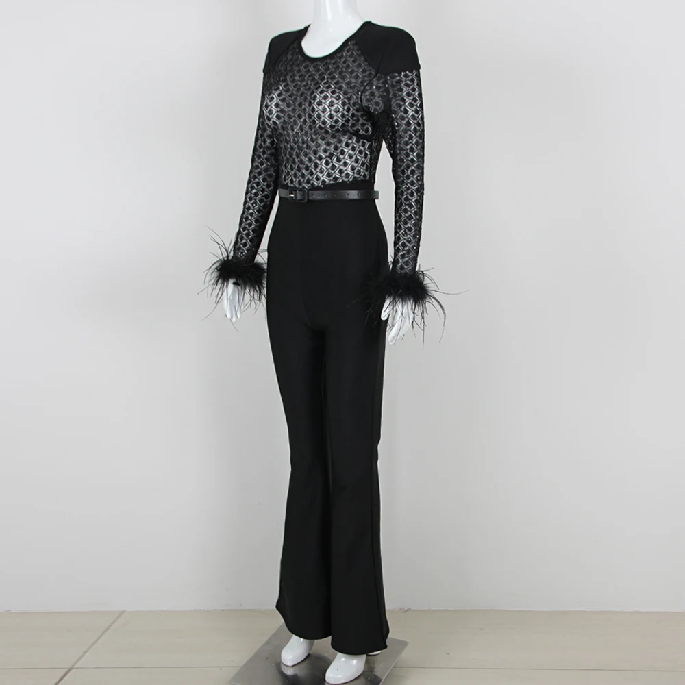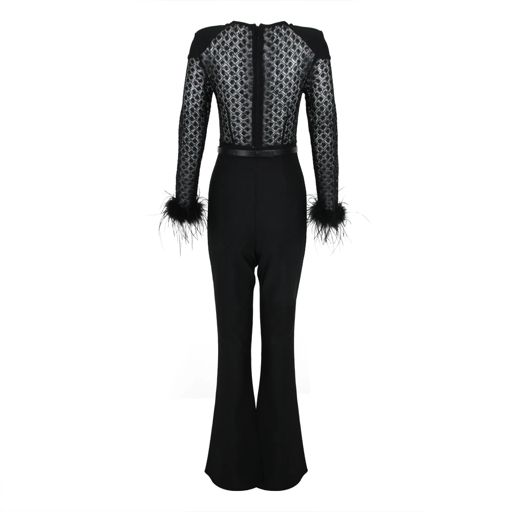Fleepmart New Style Women Long Sleeve Sexy Feathers Bodycon Bandage Jumpsuit Fashion Elegant Evening Party Celebrate Jumpsuit