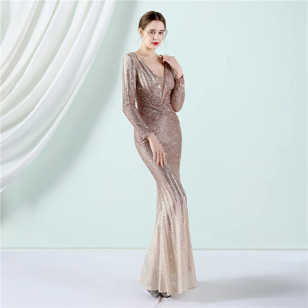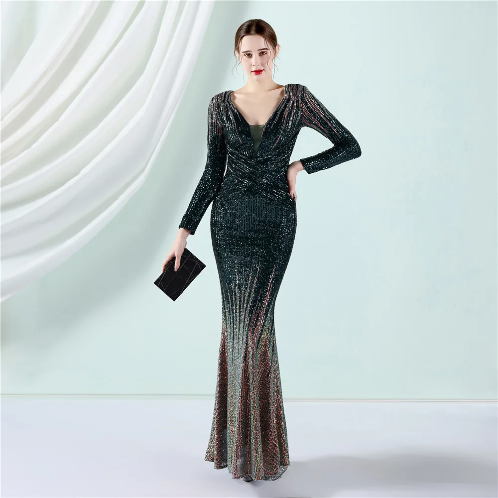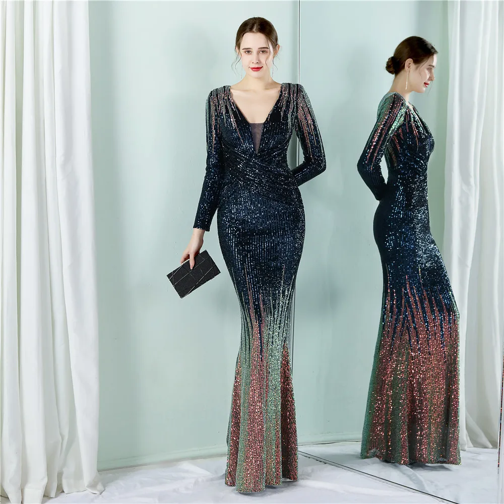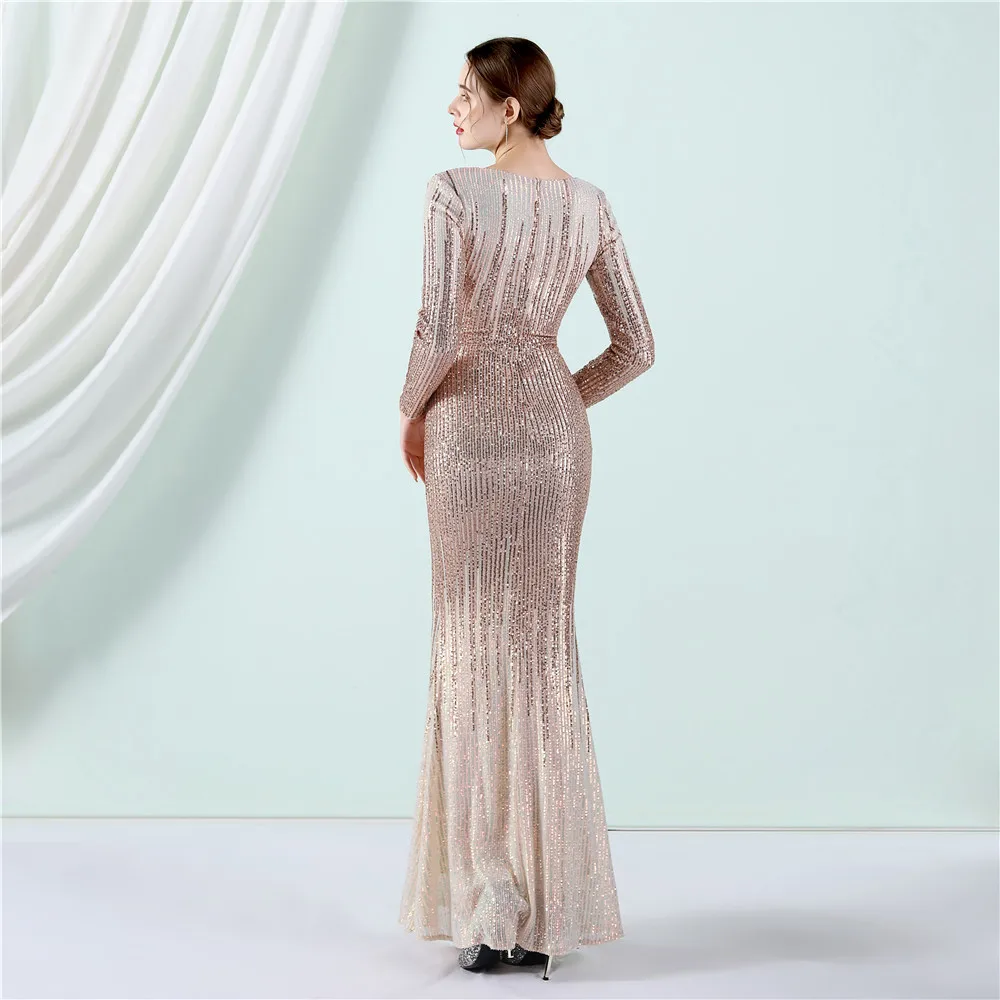 Fleepmart New Women Elegant V-neck Long Sleeve Evening Dress Sexy Mermaid Sequin 2022 Women Floor length Wedding Party Dress Vestidos