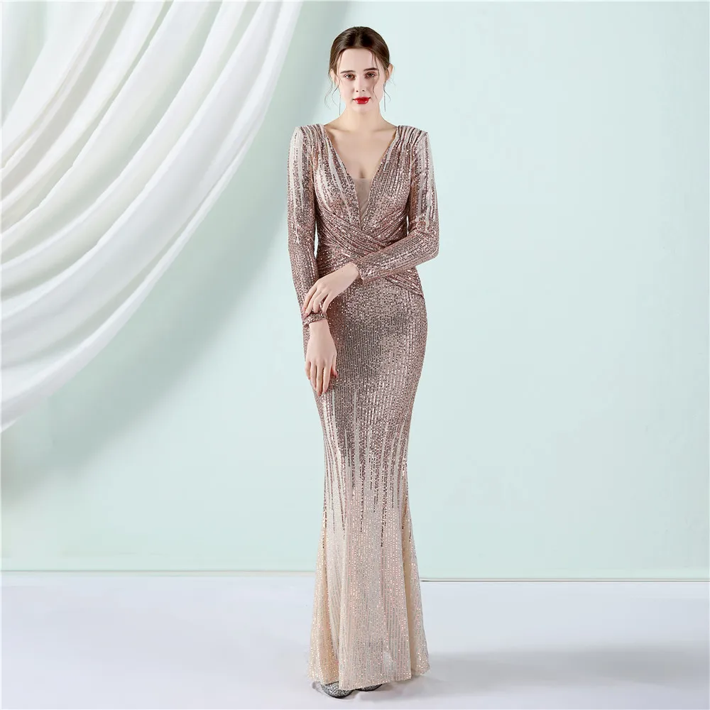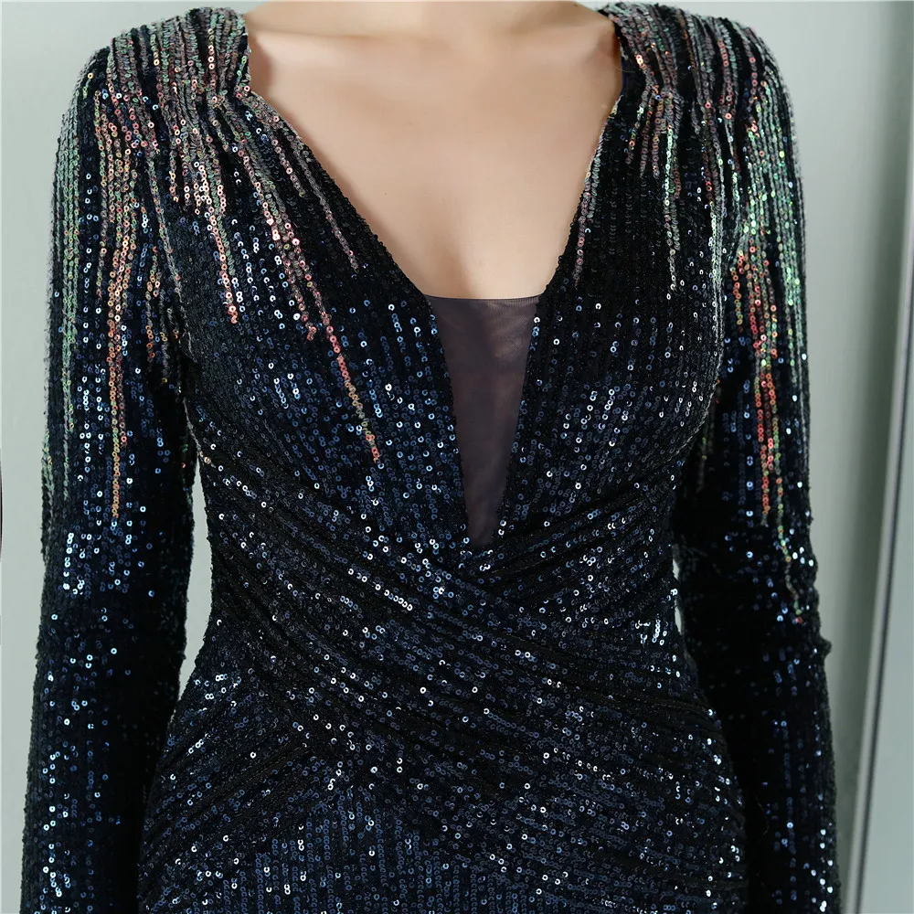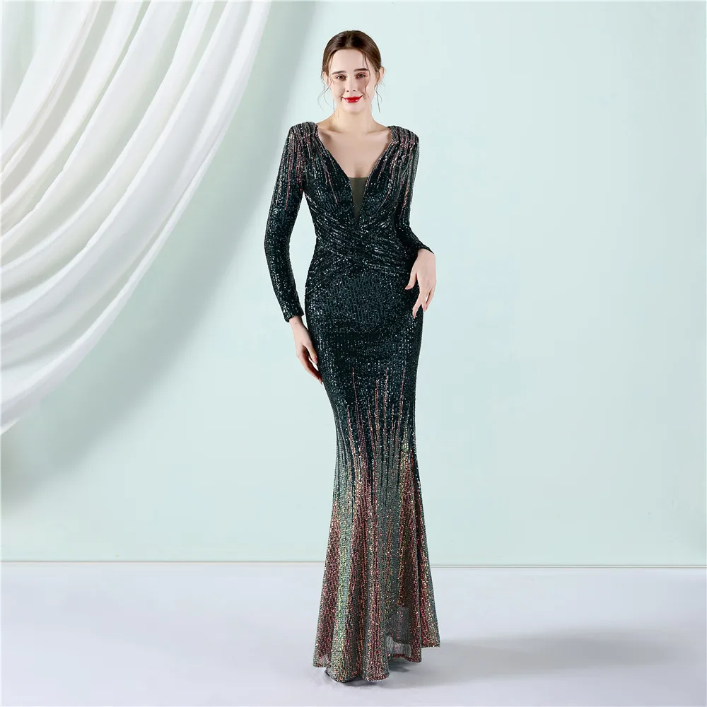 Fleepmart New Women Elegant V-neck Long Sleeve Evening Dress Sexy Mermaid Sequin 2022 Women Floor length Wedding Party Dress Vestidos
