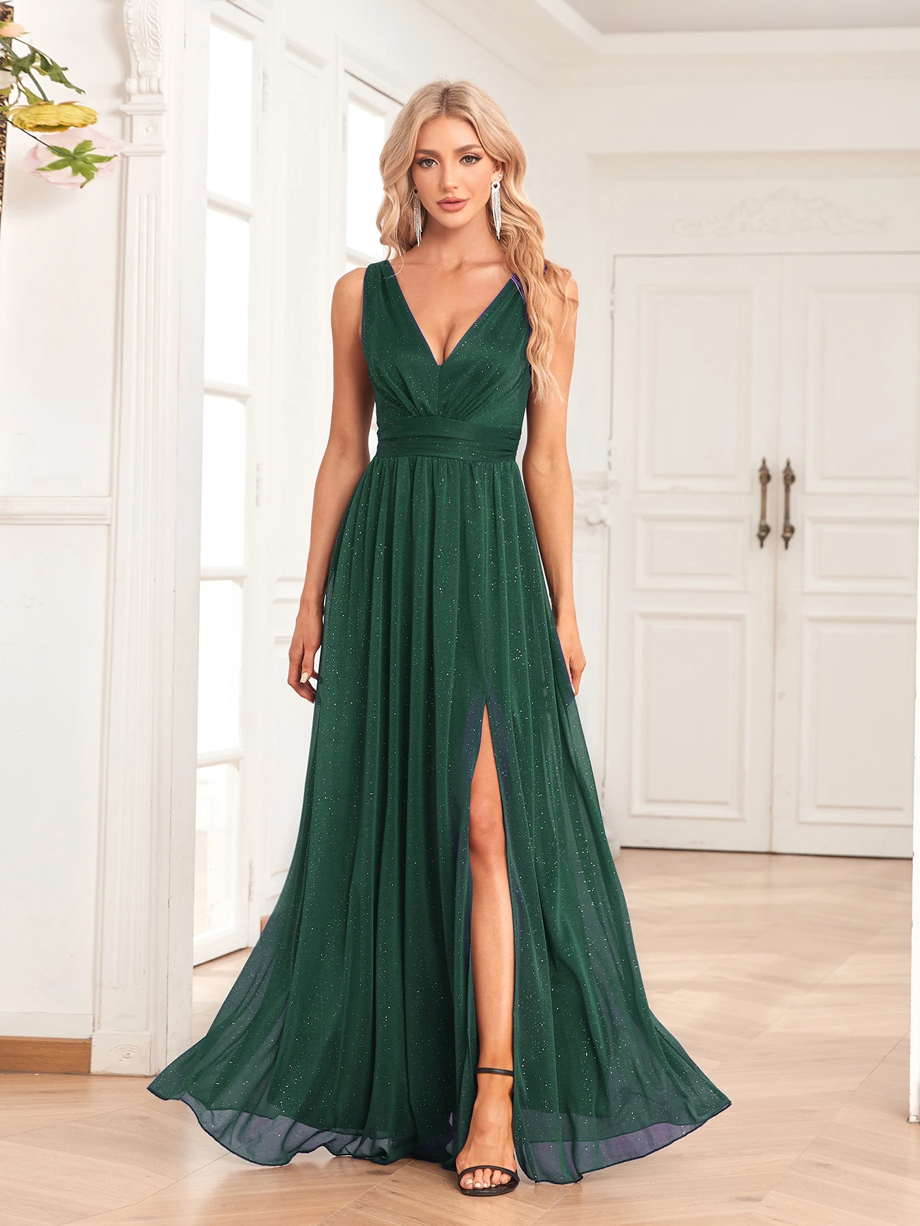 Fleepmart New Women’s Shiny Chiffon Sleeve Evening Gown Double V Neck A Line Party Gown Side Slit Floor Length Evening Gown