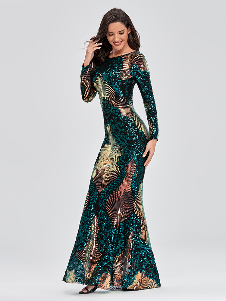 Fleepmart O-neck Long-Sleeve Shinning Sequins Evening Dresses Sexy Backless Mermaid Party Gowns Maxi Elegant Multi Female Robes vestidos