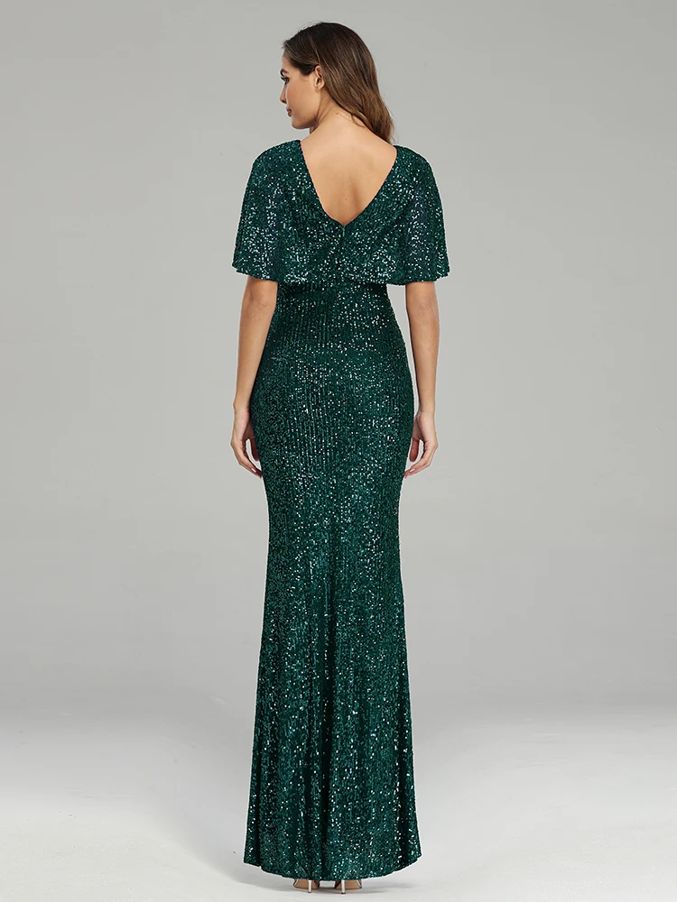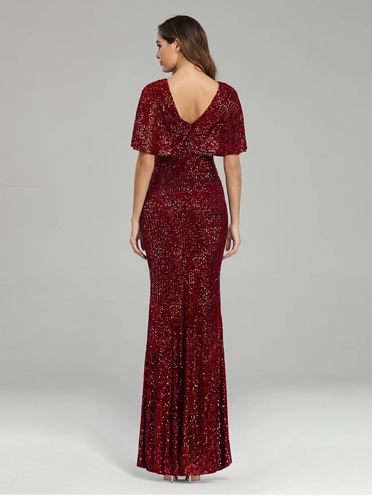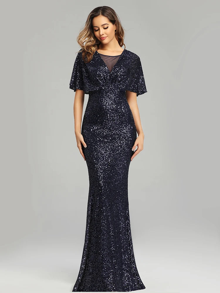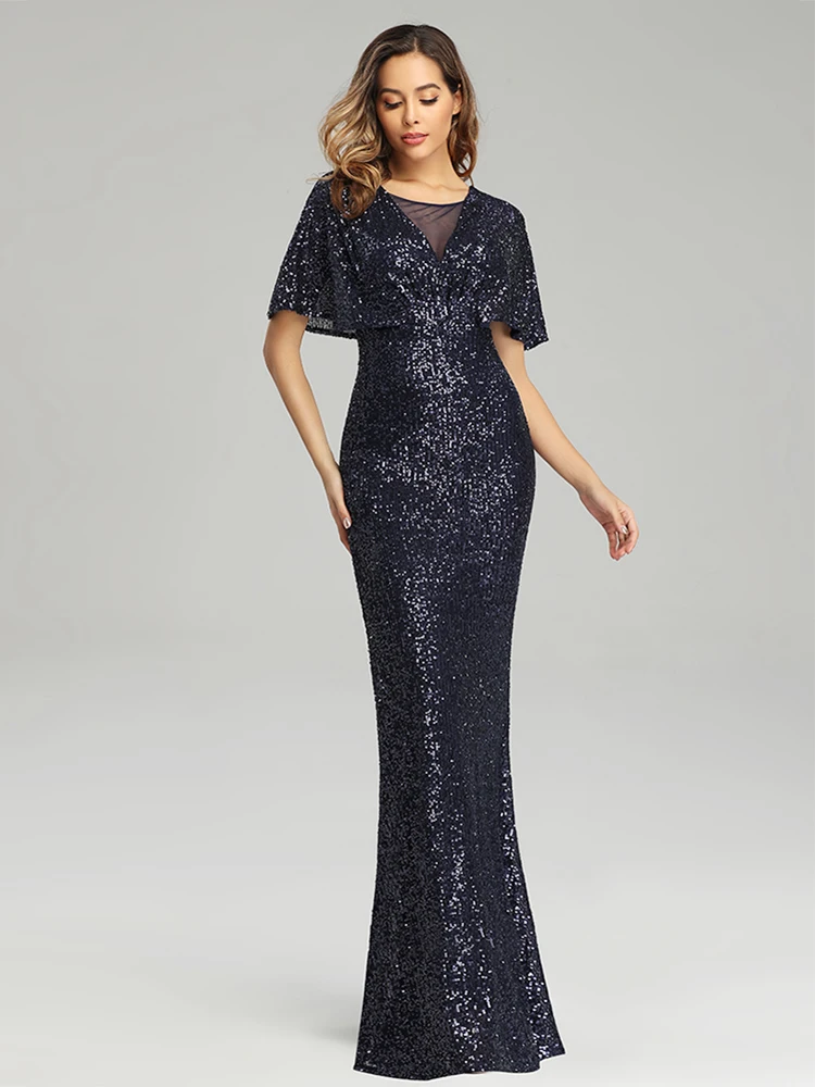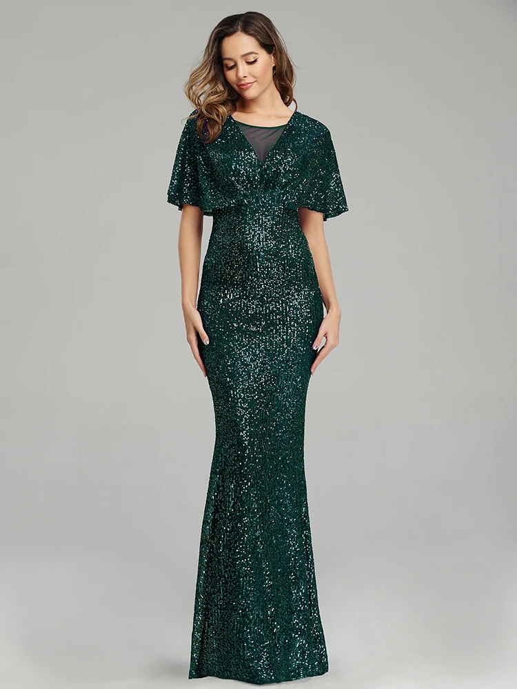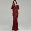 Fleepmart O-neck Sequinds Evening Dress V-Back Formal Dress for Women Short-Sleeves Mermaid Robe De Soriee Elegant Party Gowns Long Dress