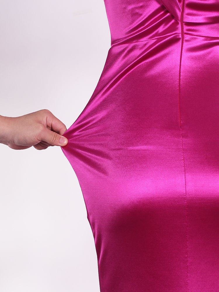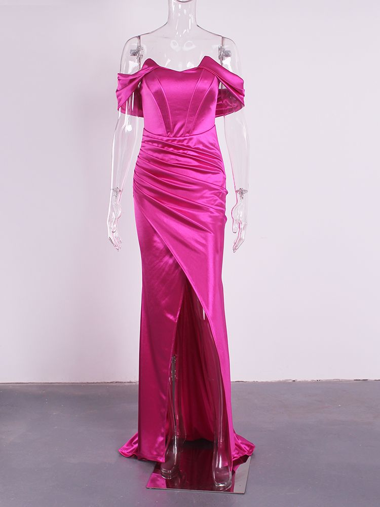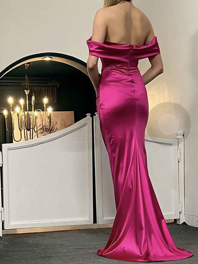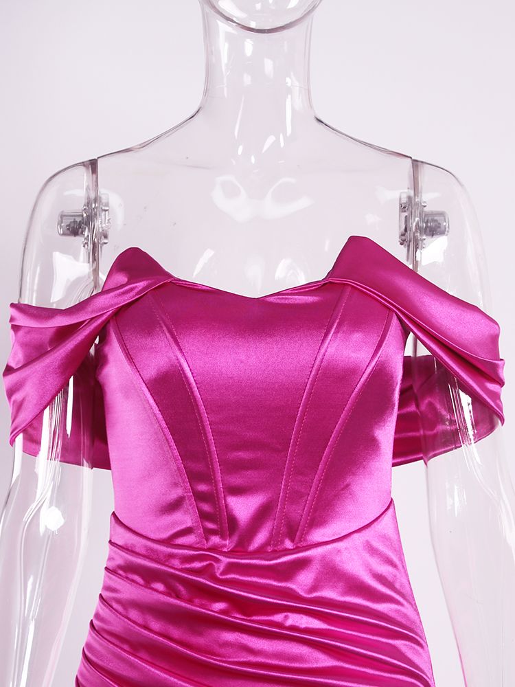 Fleepmart Off Shoulder Fuchsia Stretch Silky Satin Party Dress Boning Pleated Split Dress Mermaid Floor Length Backless Club Dress